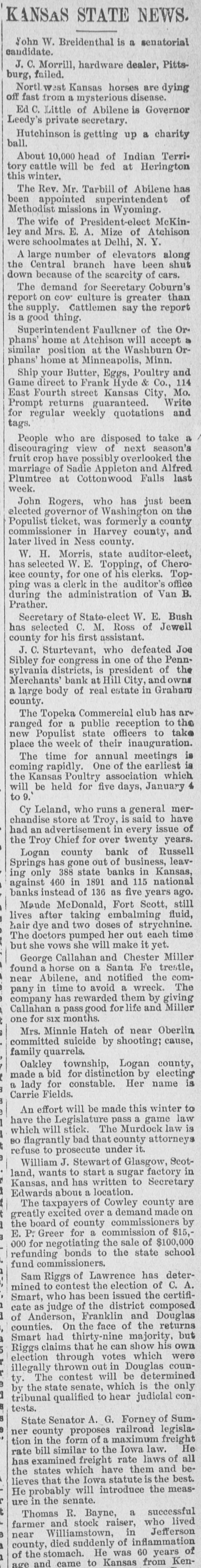 KANSAS STATE NEWS. John W. Breidenthal is a senatorial candidate. J. C. Morrill, hardware dealer, Pittsburg, failed. Nortl west Kansas horses are dying off fast from a mysterious disease. Ed C. Little of Abilene is Governor Leedy's private secretary. Hutchinson is getting up a charity ball. About 10,000 head of Indian Territory cattle will be fed at Herington this winter. The Rev. Mr. Tarbill of Abilene has been appointed superintendent of Methodist missions in Wyoming. The wife of President-elect McKinley and Mrs. E. A. Mize of Atchison were schoolmates at Delhi, N. Y. A large number of elevators along the Central branch have been shut down because of the scarcity of cars. The demand for Secretary Coburn's report on COW culture is greater than the supply. Cattlemen say the report is a good thing. Superintendent Faulkner of the Orphans' home at Atchison will accept to similar position at the Washburn Orphans' home at Minneapolis, Minn. Ship your Butter, Eggs, Poultry and Game direct to Frank Hyde & Co., 114 East Fourth street Kansas City, Mo. Prompt returns guaranteed. Write for regular weekly quotations and tags. People who are disposed to take a discouraging view of next season's fruit crop have possibly overlooked the marriage of Sadie Appleton and Alfred Plumtree at Cottonwood Falls last week. John Rogers, who has just been elected governor of Washington on the Populist ticket, was formerly a county commissioner in Harvey county, and later lived in Ness county. W. H. Morris, state auditor-elect, has selected W. E. Topping, of Cherokee county, for one of his clerks. Topping was a clerk in the auditor's office during the administration of Van B. Prather. Secretary of State-elect W. E. Bush has selected C. M. Ross of Jewell county for his first assistant. J. C. Sturtevant, who defeated Joe Sibley for congress in one of the Pennsylvania districts, is president of the Merchants' bank at Hill City, and owns a large body of real estate in Graham county. The Topeka Commercial club has are ranged for a public reception to the new Populist state officers to take place the week of their inauguration. The time for annual meetings is coming rapidly. One of the earliest is the Kansas Poultry association which will be held for five days, January 4 to 9. Cy Leland, who runs a general merchandise store at Troy, is said to have had an advertisement in every issue of the Troy Chief for over twenty years. Logan county bank of Russell Springs has gone out of business, leaving only 388 state banks in Kansas, against 460 in 1891 and 115 national banks instead of 136 as five years ago. Mande McDonald, Fort Scott, still lives after taking embalming fluid, hair dye and two doses of strychnine. The doctors pumped her out each time but she vows she will make it yet. George Callahan and Chester Miller found a horse on a Santa Fe trestle, near Abilene, and notified the company in time to avoid a wreck. The company has rewarded them by giving Callahan a pass good for life and Miller one for SIX months. Mrs. Minnie Hatch of near Oberlin committed suicide by shooting; cause, family quarrels. Oakley township, Logan county, made a bid for distinction by electing a lady for constable. Her name is Carrie Fields. An effort will be made this winter to have the Legislature pass a game law which will stick. The Murdock law is BO flagrantly bad that county attorneys refuse to prosecute under it. William J. Stewart of Glasgow, Scotland, wants to start a sugar factory in Kansas, and has written to Secretary Edwards about a location. The taxpayers of Cowley county are greatly excited over a demand made on the board of county commissioners by E. P. Greer for a commission of $15,000 for negotiating the sale of $100,000 refunding bonds to the state school fund commissioners. Sam Riggs of Lawrence has determined to contest the election of C. A. Smart, who has been issued the certificate as judge of the district composed of Anderson, Franklin and Douglas counties. On the face of the returns Smart had thirty-nine majority, but Riggs claims that he can show his own election through votes which were illegally thrown out in Douglas county. The contest will be determined by the state senate, which is the only tribunal qualified to hear judicial contests. State Senator A. G. Forney of Sumner county proposes railroad legislation in the form of a maximum freight rate bill similar to the Iowa law. He has examined freight rate laws of all the states which have them and believes that the Iowa statute is the best. He probably will introduce the measure in the senate. Thomas R. Bayne, a successful farmer and stock raiser, who lived near Williamstown, in Jefferson