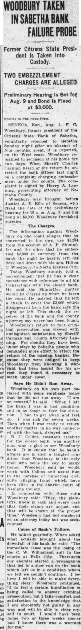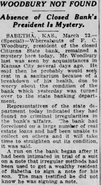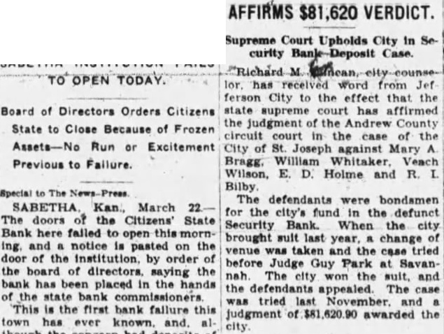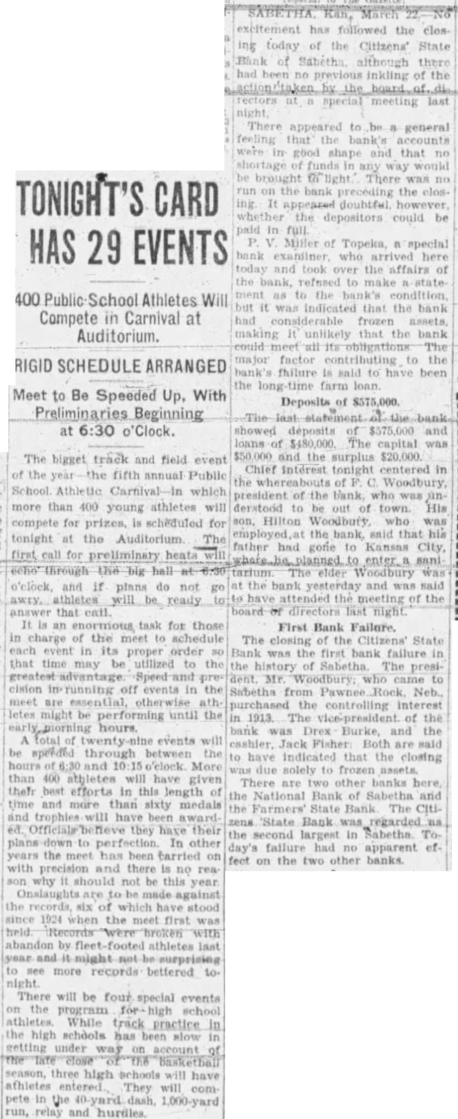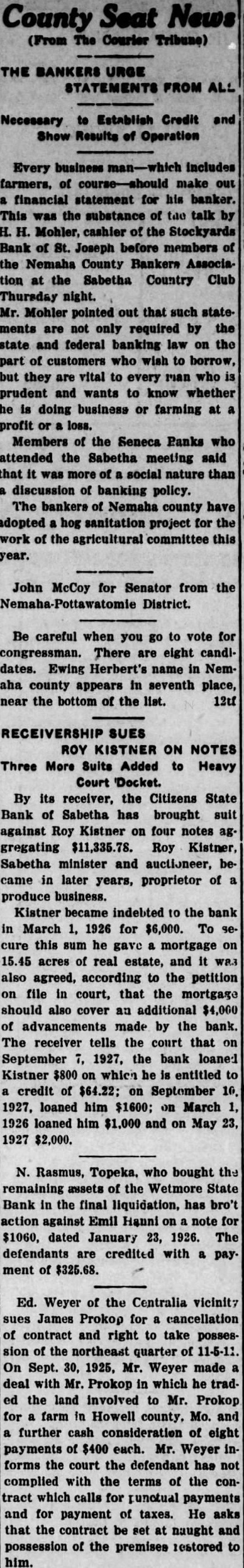 RECEIVERSHIP SUES ROY KISTNER ON NOTES Three More Suits Added to Heavy Court Docket. By its receiver, the Citizens State Bank of Sabetha has brought suit against Roy Kistner on four notes ag. gregating $11,335.78. Roy Kistner, Sabetha minister and auctioneer, became in later years, proprietor of a produce business. Kistner became indebted to the bank in March 1, 1926 for $6,000. To secure this sum he gave a mortgage on 15.45 acres of real estate, and it was also agreed, according to the petition on file in court, that the mortgage should also cover an additional $4,000 of advancements made by the bank. The receiver tells the court that on September 7, 1927, the bank loaned Kistner $800 on which he is entitled to a credit of $64.22; on September 10. 1927, loaned him $1600; on March 1, 1926 loaned him $1,000 and on May 23, 1927 $2,000.