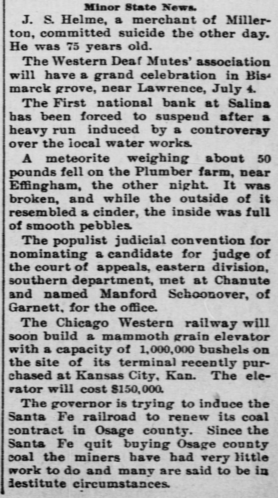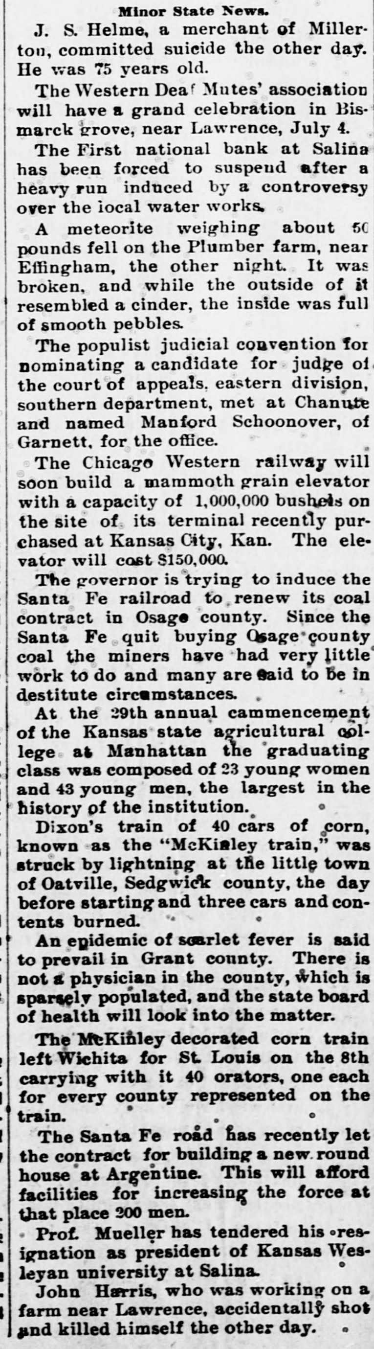 KANSAS STATE NEWS. State Republican League. The ninth annual convention of the state republican league has been called to meet at Topeka July 1. The official call has been issued by President Scott and Secretary Gault, and is tee by authority of the executive commitwhich met in Topeka last January. The to business of the convention will be to elect officers for the ensuing elect delegates to represent year; the state in the annual convention of the national republican league of the United States which will be held in Milwaukee, August 25-27, 1896, and to transact in other business. Each league the state will be entitled to be resented by its president and three repother delegates to be chosen by the club. Among other interesting features of the meeting will be an address by Gen. C. H. Grosvenor, of Ohio J. S. Helme, Miscellaneous. a merchant of Millerton, committed suicide the other day. He was 75 years old. The Western Deaf Mutes' association will have a grand celebration in Bismarck grove, near Lawrence, July 4. The First national bank at Salina has been forced to suspend after heavy run induced by a controversy a over the local water works. A meteorite weighing about 50 pounds fell on the Plumber farm, near Effingham, the other night. It was broken, and while the outside of it resembled a cinder, the inside was full of smooth pebbles. The populist judicial convention for nominating a candidate for judge of the court of appeals, eastern division, southern department, met at Chanute and named Manford Schoonover, of Garnett, for the office. The Chicago Western railway will soon build a mammoth grain elevator with a capacity of 1,000,000 bushels on the site of its terminal recently purchased at Kansas City, Kan. The elevator will cost $150,000. At the 29th annual cammencement of the Kansas state agricultural college at Manhattan the graduating class was composed of 23 young women and 43 young men, the largest in the history of the institution. Four small boys," Dennisand Michael Desmond, 11 and 6 years old, and Daniel and Eugene Cummings, 7 and 5 years old, took refuge in a culvert during a recent storm at Leavenworth and were drowned by the sudden rise of the stream. The governor is trying to induce the Santa Fe railroad to renew its coal contract in Osage county. Since the Santa Fe quit buying Osage county coal the miners have had very little work to do and many are said to be in destitute circumstances. Samuel Dodsworth, formerly mayor of Leavenworth, who had been sick for some time in a hospital in St. Louis, committed suicide in that institution the been other day. He had for many years proprietor of a large printing and bookbinding worth. establishment in LeavenAt the twenty-fourth annual commencement of the state university at Lawrence degrees were conferred on 118 graduates, 56 from the school of arts, 8 from the school of engineering, 14 from the school of pharmacy, 35 from the school of law and 5 from the school of fine arts. The residence of Henry Munn, for merly a bookkeeper in an insurance office at Atchison, was discovered to be on fire the other morning and an in n vestigation divulged the fact that seven of the eight rooms were saturat ed with coal oil. Munn was arrested charged with arson. The house and furniture were well insured. The various railway companies, it is said, oppose the idea of making the full annual report required by the railroad commissioners, declaring i impossible, owing to the necessity o collecting special statistics and incur ring an enormous expense. The claim that the desired information i not in their possession and could hard ly be obtained. George D. Trimmer, of Wetmore while bathing in the Cottonwood rive at Emporia, the other day, was take e with cramps and drowned. He editor of the Republican at Filley wa e Neb., but was doing special work an attending commencement exercises a the state normal school, and at th time of his death was attending a pie nic of students. An even 100 graduates received d plomas at the late commencement da d exercises at the Kansas state norma school at Emporia, and each of thes diplomas is by law a life certificate 11 teach school in the state of Kansas, well as being a first-class recommend e tion anywhere in the civilized world he Nearly every county in the state Kansas was represented in this year class, and quite a number of neighbo ing states, Missouri and Illinois takin S precedence in number. ed State Superintendent of Public I ad struction two dink Stanley has recently receive