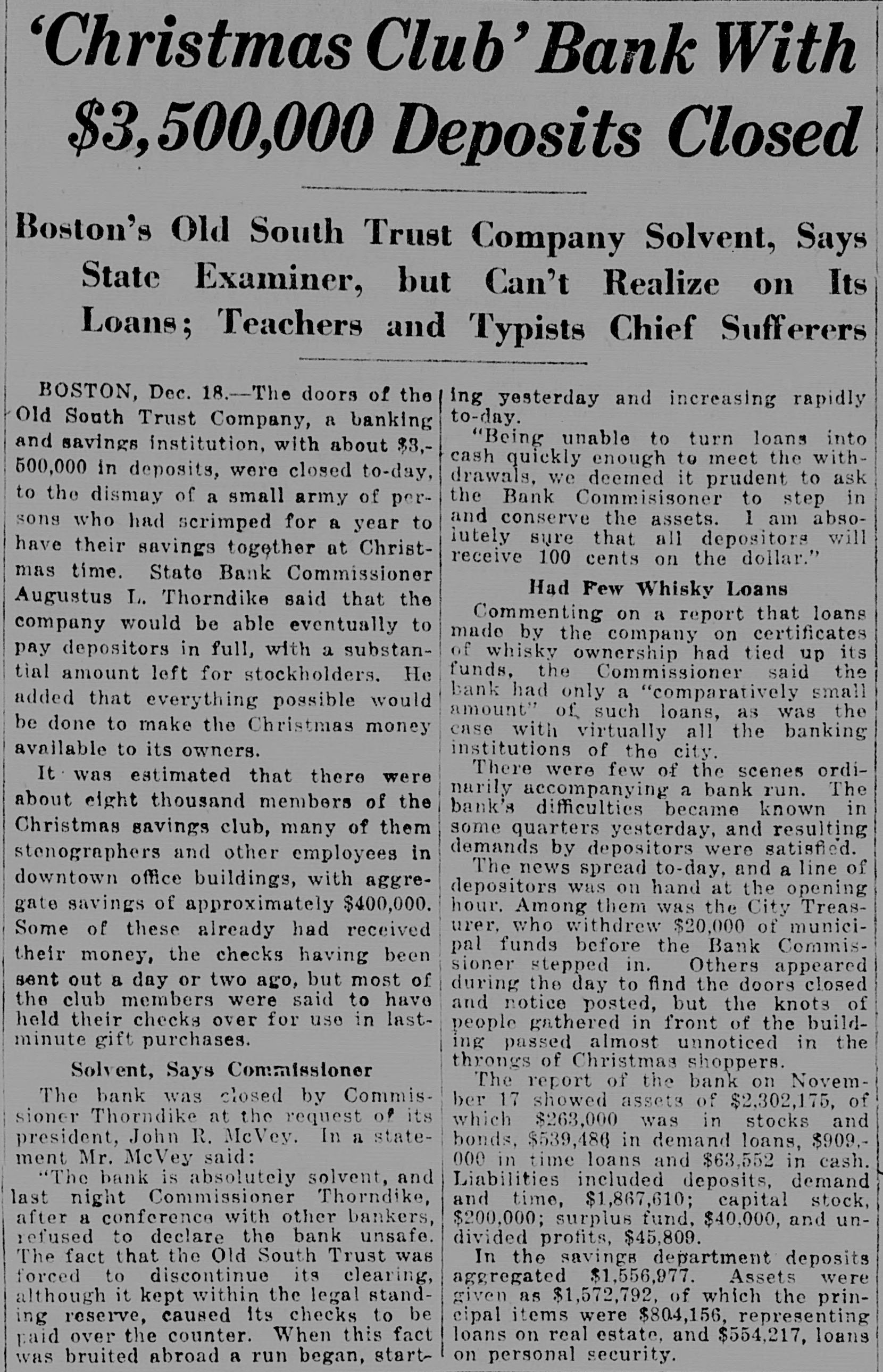 Christmas Club' Bank With $3,500,000 Deposits Closed Boston's Old South Trust Company Solvent, Says State Examiner, but Can't Realize on Its Loans; Teachers and Typists Chief Sufferers BOSTON, Dec. 18.--The doors of the ing yesterday and increasing rapidly to-day. Old South Trust Company, a banking "Being unable to turn loans into and savings institution, with about $3,cash quickly enough to meet the with500,000 in deposits, were closed to-day, drawals. we deemed it prudent to ask to the dismay of a small army of perthe Bank Commisisoner to step in and conserve the assets. 1 am absosons who had scrimped for a year to lutely sure that all depositors will have their savings together at Christreceive 100 cents on the dollar." mas time. State Bank Commissioner Had Few Whisky Loans Augustus L. Thorndike said that the Commenting on a report that loans company would be able eventually to made by the company on certificates pay depositors in full, with a substanof whisky ownership had tied up its funds. the Commissioner said the tial amount left for stockholders. He bank had only a "comparatively small added that everything possible would amount" of, such loans, as was the be done to make the Christmas money case with virtually all the banking available to its owners. institutions of the city. There were few of the scenes ordiIt was estimated that there were narily accompanying a bank run. The about eight thousand members of the bank's difficulties became known in Christmas savings club, many of them some quarters yesterday, and resulting demands by depositors were satisfied. stenographers and other employees in The news spread to-day, and a line of downtown office buildings, with aggredepositors was on hand at the opening gate savings of approximately $400,000. hour. Among them was the City Treasurer, who withdrew $20,000 of municiSome of these already had received pal funds before the Bank Commistheir money, the checks having been sioner stepped in. Others appeared sent out a day or two ago, but most of during the day to find the doors closed the club members were said to have and notice posted, but the knots of held their checks over for use in lastpeople gathered in front of the buildminute gift purchases. ing passed almost unnoticed in the throngs of Christmas shoppers. Solvent, Says Commissioner The report of the bank on NovemThe bank was closed by Commisber 17 showed assets of $2,302,175, of sioner Thorndike at the request of its which $263,000 was in stocks and president, John R. McVey. In a statebonds, $539,486 in demand loans, $909.ment Mr. McVey said: 000 in time loans and $63,552 in cash. "The bank is absolutely solvent, and Liabilities included deposits, demand last night Commissioner Thorndike, and time, $1,867,610; capital stock, after a conference with other bankers, $200,000; surplus fund, $40,000, and unrefused to declare the bank unsafe. divided profits, $45,809. The fact that the Old South Trust was In the savings department deposits forced to discontinue its clearing, aggregated $1,556,977. Assets were although it kept within the legal standgiven as $1,572,792, of which the principal items were $804,156, representing ing reserve, caused its checks to be loans on real estate, and $554,217, loans paid over the counter. When this fact on personal security. was bruited abroad a run began, start-