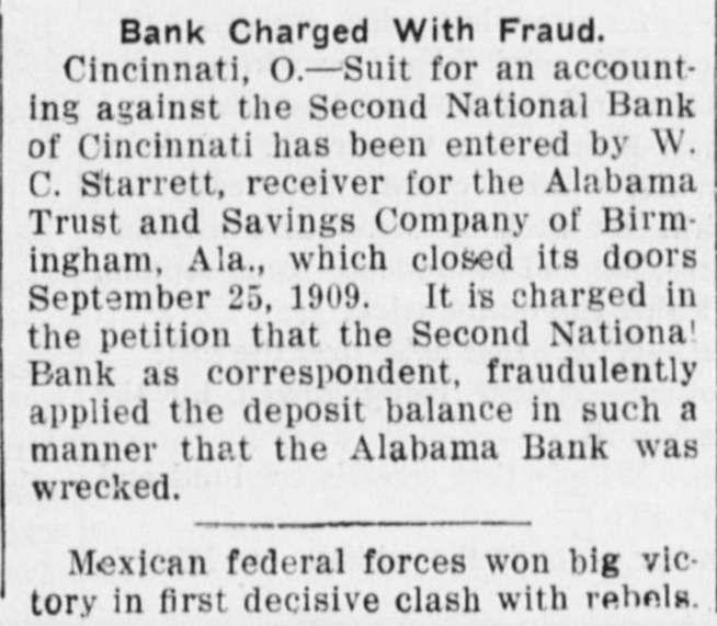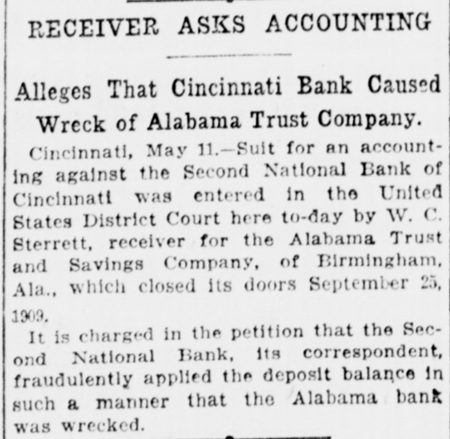 SUES FOR ACCOUNTING. Bank Receiver Makes Charges Against Cincinnati Institution. CINCINNATI, Ohio May 11.-Suit for an accounting against the Second National Bank of Cincinnati was entered in the United States district court here today by W. C. Sterrett, receiver for the Alabama Trust and Savings Company of Birmingham, Ala., which closed its doors September 25, 1909. It is charged in the petition that the Second National Bank, its correspondent, fraudulently applied the deposit balance in such a manner that the Alabama bank was wrecked.