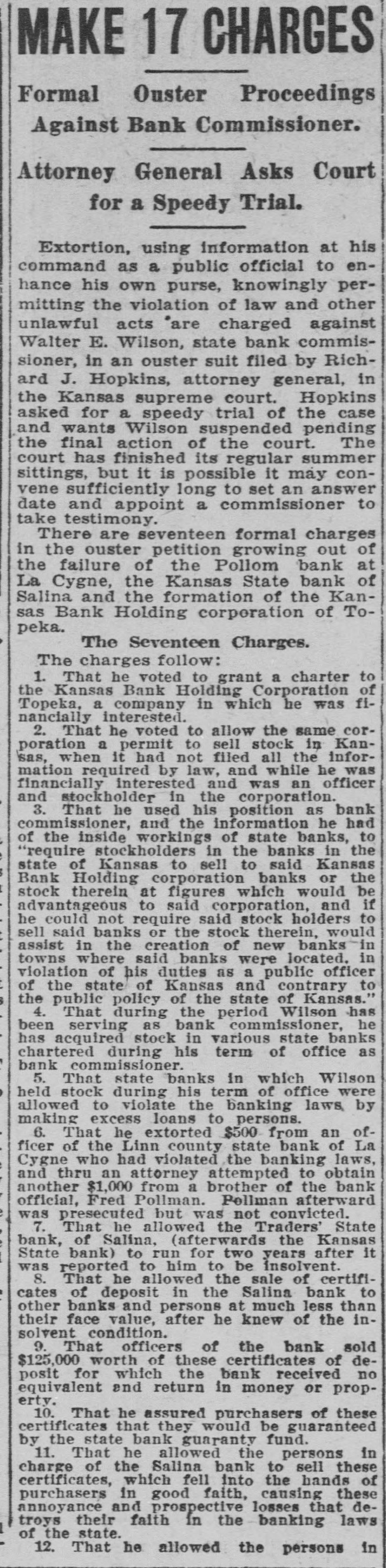 MAKE 17 CHARGES Formal Ouster Proceedings Against Bank Commissioner. Attorney General Asks Court for a Speedy Trial. Extortion, using information at his command as a public official to enhance his own purse, knowingly permitting the violation of law and other unlawful acts "are charged against Walter E. Wilson, state bank commissioner, in an ouster suit filed by Richard J. Hopkins, attorney general, in the Kansas supreme court. Hopkins asked for a speedy trial of the case and wants Wilson suspended pending the final action of the court. The court has finished its regular summer sittings, but it is possible it may convene sufficiently long to set an answer date and appoint a commissioner to take testimony. There are seventeen formal charges in the ouster petition growing out of the failure of the Pollom bank at La Cygne, the Kansas State bank of Salina and the formation of the Kansas Bank Holding corporation of Topeka. The Seventeen Charges. The charges follow: 1. That he voted to grant a charter to the Kansas Bank Holding Corporation of Topeka, a company in which he was financially interested. 2. That he voted to allow the same corporation a permit to sell stock in Kansas, when it had not filed all the information required by law, and while he was financially interested and was an officer and stockholder in the corporation. 3. That he used his position as bank commissioner, and the information he had of the inside workings of state banks, to "require stockholders in the banks in the state of Kansas to sell to said Kansas Bank Holding corporation banks or the stock therein at figures which would be advantageous to said corporation, and if he could not require said stock holders to sell said banks or the stock therein, would assist in the creation of new banks in towns where said banks were located. in violation of his duties as a public officer of the state of Kansas and contrary to the public policy of the state of Kansas." 4. That during the period Wilson has been serving as bank commissioner, he has acquired stock in various state banks chartered during his term of office as bank commissioner. 5. That state banks in which Wilson held stock during his term of office were allowed to violate the banking laws, by making excess loans to persons. 6. That he extorted $500 from an officer of the Linn county state bank of La Cygne who had violated the banking laws, and thru an attorney attempted to obtain another $1,000 from a brother of the bank official, Fred Pollman. Pollman afterward was presecuted but was not convicted. 7. That he allowed the Traders' State bank, of Salina, (afterwards the Kansas State bank) to run for two years after it was reported to him to be insolvent. 8. That he allowed the sale of certificates of deposit in the Salina bank to other banks and persons at much less than their face value, after he knew of the insolvent condition. 9. That officers of the bank sold $125,000 worth of these certificates of deposit for which the bank received no equivalent and return in money or property. 10. That he assured purchasers of these certificates that they would be guaranteed by the state bank guaranty fund. 11. That he allowed the persons in charge of the Salina bank to sell these certificates, which fell into the hands of purchasers in good faith, causing these annoyance and prospective losses that detroys their faith in the banking laws of the state. 12. That he allowed the persons in