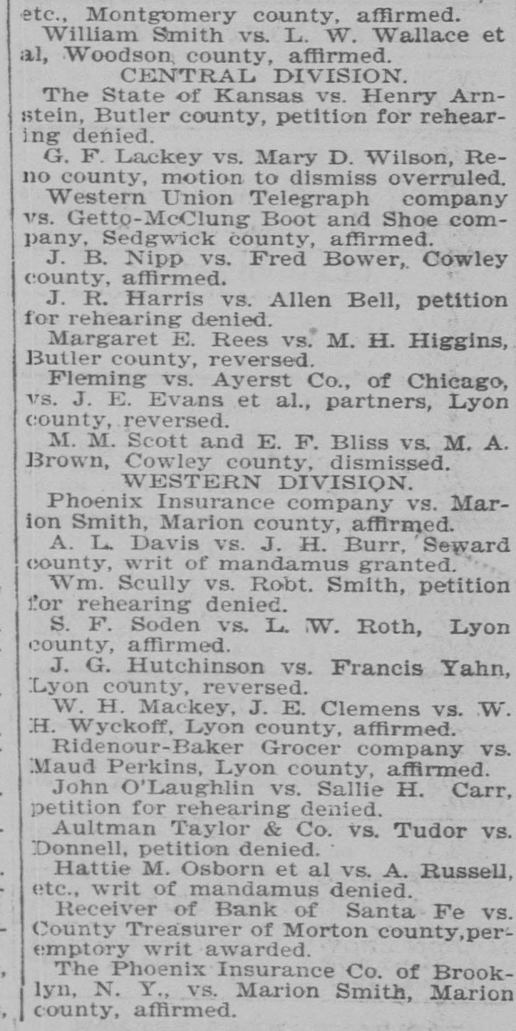 etc., Montgomery county, affirmed. William Smith vs. L. W. Wallace et al, Woodson county, affirmed. # CENTRAL DIVISION. The State of Kansas vs. Henry Arn- stein, Butler county, petition for rehear- ing denied. G. F. Lackey vs. Mary D. Wilson, Re- no county, motion to dismiss overruled. Western Union Telegraph company vs. Getto-McClung Boot and Shoe com- pany, Sedgwick county, affirmed. J. B. Nipp vs. Fred Bower, Cowley county, affirmed. J. R. Harris vs. Allen Bell, petition for rehearing denied. Margaret E. Rees vs. M. H. Higgins, Butler county, reversed. Fleming vs. Ayerst Co., of Chicago, vs. J. E. Evans et al., partners, Lyon county, reversed. M. M. Scott and E. F. Bliss vs. M. A. Brown, Cowley county, dismissed. # WESTERN DIVISION. Phoenix Insurance company vs. Mar- ion Smith, Marion county, affirmed. A. L. Davis vs. J. H. Burr, Seward county, writ of mandamus granted. Wm. Scully vs. Robt. Smith, petition for rehearing denied. S. F. Soden vs. L. W. Roth, Lyon county, affirmed. J. G. Hutchinson vs. Francis Yahn, Lyon county, reversed. W. H. Mackey, J. E. Clemens vs. W. H. Wyckoff, Lyon county, affirmed. Ridenour-Baker Grocer company vs. Maud Perkins, Lyon county, affirmed. John O'Laughlin vs. Sallie H. Carr, petition for rehearing denied. Aultman Taylor & Co. vs. Tudor vs. Donnell, petition denied. Hattie M. Osborn et al vs. A. Russell, etc., writ of mandamus denied. Receiver of Bank of Santa Fe vs. County Treasurer of Morton county, per- emptory writ awarded. The Phoenix Insurance Co. of Brook- lyn, N. Y., vs. Marion Smith, Marion county, affirmed.