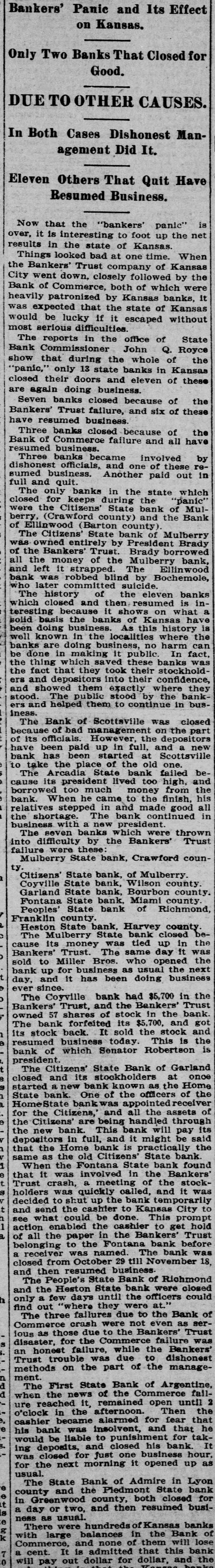 Bankers' Panic and Its Effect on Kansas. Only Two Banks That Closed for Good. DUETOOTHER CAUSES. In Both Cases Dishonest Management Did It. Eleven Others That Quit Have Resumed Business. is Now that the "bankers' panic" over, it is interesting to foot up the net results in the state of Kansas. Things looked bad at one time. When the Bankers' Trust company of Kansas City went down, closely followed by the Bank of Commerce, both of which were heavily patronized by Kansas banks, it was expected that the state of Kansas would be lucky if it escaped without most serious difficulties. The reports in the office of State Bank Commissioner John Q. Royce show that during the whole of the 'panic," only 13 state banks in Kansas closed their doors and eleven of these are again doing business. Seven banks closed because of the Bankers' Trust failure, and six of these have resumed business. Three banks closed because of the Bank of Commerce failure and all have resumed business. Three banks became involved by dishonest officials, and one of these resumed business. Another paid out in full and quit. The only banks in the state which closed for keeps during the panic' were the Citizens' State bank of Mulberry (Crawford county) and the Bank of Ellinwood (Barton county) The Citizens' State bank of Mulberry was owned entirely by President Brady of the Bankers' Trust. Brady borrowed all the money of the Mulberry bank, and left it strapped. The Ellinwood bank was robbed blind by Bochemole, who later committed suicide. The history of the eleven banks which closed and then resumed is ina teresting because it shows on what solid basis the banks of Kansas have been doing business. As this history is well known in the localities where the banks are doing business, no harm can be done in making it public In fact, the thing which saved these banks was the fact that they took their stockholders and depositors into their confidence, and showed them exactly where they stood. The public stood by the bankand helped them to continue in business. The Bank of Scottsville was closed because of bad management on the part of its officials. However, the depositors have been paid up in full, and a new bank has been started at Scottsville to take the place of the old one. The Arcadia State bank failed because its president lived too high, and borrowed too much money from the bank. When he came to the finish, his relatives stepped in and made good all in the shortage. The bank continued business with a new president. The seven banks which were thrown into difficulty by the Bankers' Trust failure were these Mulberry State bank, Crawford county Citizens' State bank, of Mulberry. Coyville State bank, Wilson county. Garland State bank, Bourbon county. Fontana State bank. Miami county Peoples State bank of Richmond, Franklin county Heston State bank. Harvey county. The Mulberry State bank closed because its money was tied up in the Bankers' Trust The same day it was sold to Miller Bros. who opened the bank up for business as usual the next day, and it has been doing business ever since. The Coyville bank had $5,700 in the Bankers' Trust, and the Bankers' Trust owned 57 shares of stock in the bank. The bank forfeited its $5,700, and got its stock back. It sold the stock and resumed business today This is the bank of which Senator Robertson is president The Citizens' State Bank of Garland closed and its stockholders at once started a new bank known as the Home State bank. One of the officers of the HomeState bank was appointed receive for the Citizens, and all the assets of the Citizens' are being handled through the new bank. This bank will pay its depositors in full, and it might be said that the Home bank is practically the same as the old Citizens' State bank. When the Fontana State bank found a that it was involved in the Bankers' Trust crash, meeting of the stockholders was quickly called, and it was decided to shut up the bank temporarily and send the cashier to Kansas City to see what could be done. This prompt action enabled the cashier to get hold of all the paper in the Bankers' Trust belonging to the Fontana bank before a receiver was named. The bank was closed from October 29 till November 18, and then resumed business. The People's State Bank of Richmond and the Heston State bank were closed only a few days until the officers could find out "where they were at.' The three failures due to the Bank of Commerce crash were not even as serious as those due to the Bankers' Trust disaster, for the Commerce failure was an honest failure, while the Bankers' Trust trouble was due to dishonest methods on the part of the management. The First State Bank of Argentine, when the news of the Commerce falld ure reached it. remained open until 2 o'clock in the afternoon. Then the cashier became alarmed for fear that e his bank was insolvent, and that he would be liable to punishment for taking deposits, and closed his bank. It was closed for just one business hour. for the next morning it opened up as usual. The State Bank of Admire in Lyon e county and the Pledmont State bank in Greenwood county, both closed for a day or two, and then resumed business as usual. There were hundreds of Kansas banks with large balances in the Bank of k Commerce, and none of them will lose a cent. It is admitted that this bank 0 will pay out dollar for dollar, and the