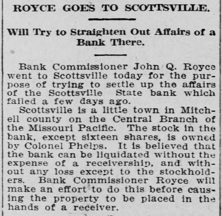 ROYCE GOES TO SCOTTSVILLE. Will Try to Straighten Out Affairs of a Bank There. Bank Commissioner John Q. Royce went to Scottsville today for the purpose of trying to settle up the affairs of the Scottsville State bank which failed a few days ago. Scottsville is a little town in Mitchell county on the Central Branch of the Missouri Pacific. The stock in the bank, except sixteen shares, is owned by Colonel Phelps. It is believed that the bank can be liquidated without the expense of a receivership, and without any loss except to the stockholders. Bank Commissioner Royce will make an effort to do this before causing the property to be placed in the hands of a receiver.