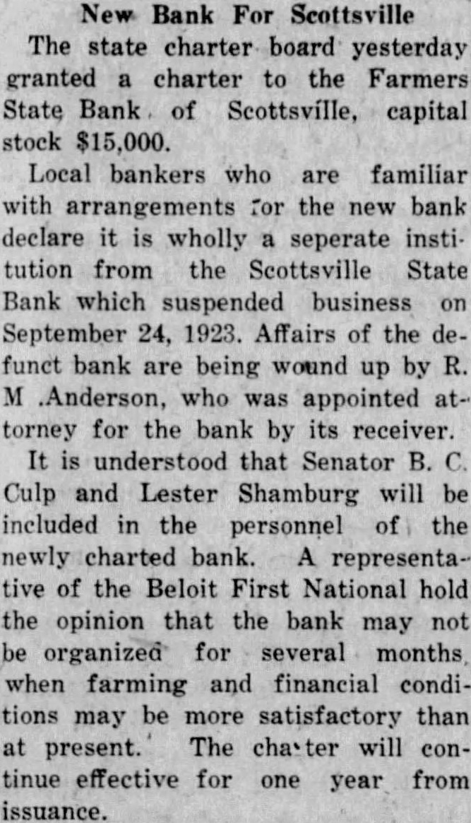 New Bank For Scottsville The state charter board yesterday granted a charter to the Farmers State Bank of Scottsville, capital stock $15,000. Local bankers who are familiar with arrangements for the new bank declare it is wholly a seperate institution from the Scottsville State Bank which suspended business on September 24, 1923. Affairs of the defunct bank are being wound up by R. M .Anderson, who was appointed attorney for the bank by its receiver. It is understood that Senator B. C. Culp and Lester Shamburg will be included in the personnel of the newly charted bank. A representative of the Beloit First National hold the opinion that the bank may not be organized for several months when farming and financial conditions may be more satisfactory than at present. The charter will continue effective for one year from issuance.