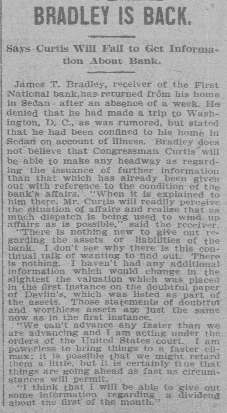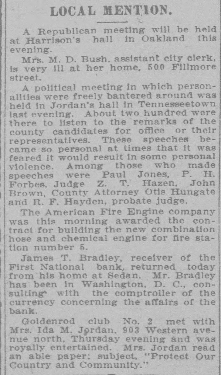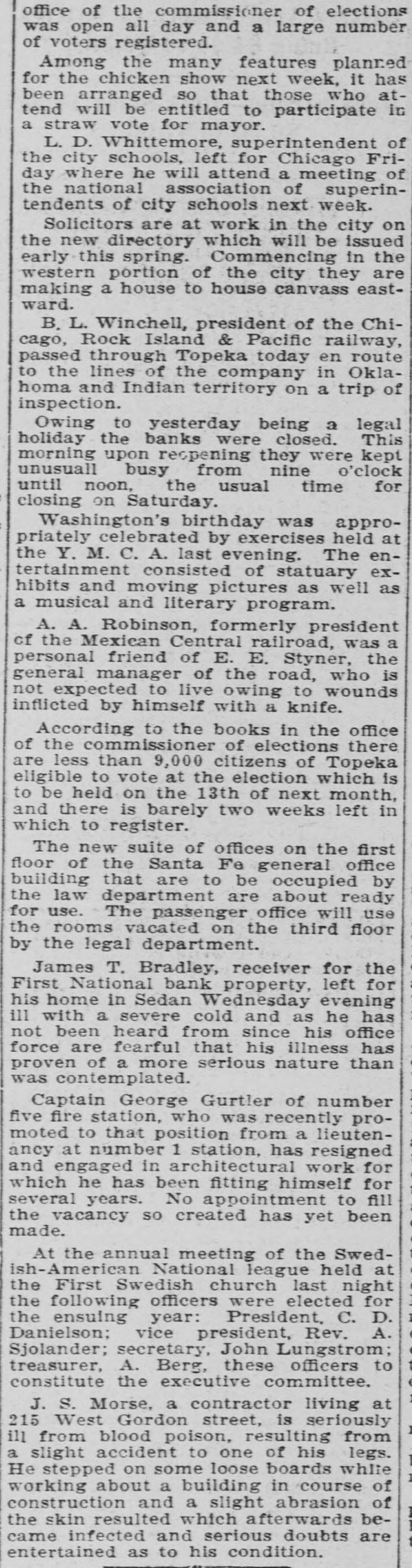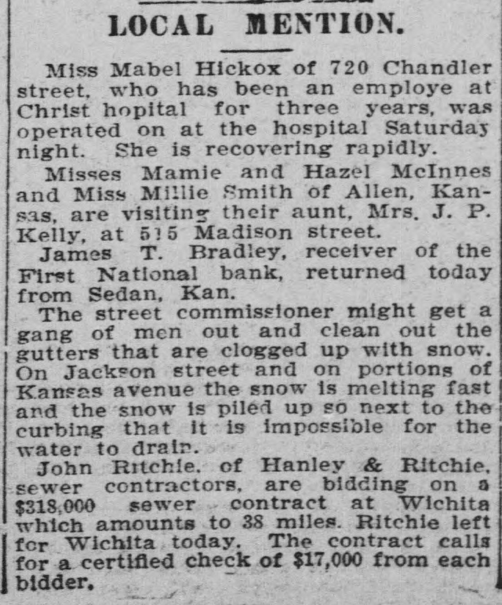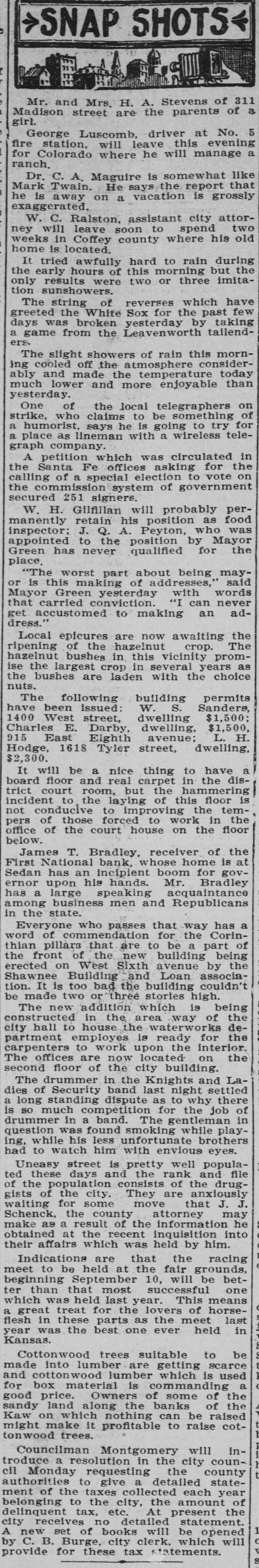 SNAP SHOTS< Mr. and Mrs. H. A. Stevens of 311 Madison street are the parents of a girl. George Luscomb, driver at No. 5 fire station, will leave this evening for Colorado where he will manage a ranch. Dr. C. A. Maguire is somewhat like Mark Twain. He says the report that he is away on a vacation is grossly exaggerated. W. C. Ralston, assistant city attorney will leave soon to spend two weeks in Coffey county where his old home is located. It tried awfully hard to rain during the early hours of this morning but the only results were two or three imitation sunshowers. The string of reverses which have greeted the White Sox for the past few days was broken yesterday by taking a game from the Leavenworth tailenders. The slight showers of rain this morning cooled off the atmosphere considerably and made the temperature today much lower and more enjoyable than yesterday. One of the local telegraphers on strike, who claims to be something of a humorist, says he is going to try for a place as lineman with a wireless telegraph company. A petition which was circulated in the Santa Fe offices asking for the calling of a special election to vote on the commission system of government secured 251 signers. W. H. Gilfillan will probably permanently retain his position as food inspector; J. Q. A. Peyton, who was appointed to the position by Mayor Green has never qualified for the place. "The worst part about being mayor is this making of addresses,' said Mayor Green yesterday with words that carried conviction. "I can never get accustomed to making an address." Local epicures are now awaiting the ripening of the hazelnut crop. The hazelnut bushes in this vicinity promise the largest crop in several years as the bushes are laden with the choice nuts. The following building permits have been issued: W. S. Sanders, 1400 West street, dwelling $1,500; Charles E. Darby, dwelling, $1,500, 915 East Eighth avenue; L. H. Hodge, 1618 Tyler street, dwelling, $2,300. It will be a nice thing to have a board floor and real carpet in the district court room, but the hammering incident to the laying of this floor is not conducive to improving the tempers of those forced to work in the office of the court house on the floor below. James T. Bradley, receiver of the First National bank, whose home is at Sedan has an incipient boom for governor upon his hands. Mr. Bradley has a large speaking acquaintance among business men and Republicans in the state. Everyone who passes that way has a word of commendation for the Corinthian pillars that are to be a part of the front of the new building being erected on West Sixth avenue by the Shawnee Building and Loan association. It is too bad the building couldn't be made two or three stories high. The new addition which is being constructed in the area way of the city hall to house the waterworks department employes is ready for the carpenters to work upon the interior. The offices are now located on the second floor of the city building. The drummer in the Knights and Ladies of Security band last night settled a long standing dispute as to why there is so much competition for the job of drummer in a band. The gentleman in question was found smoking while playing, while his less unfortunate brothers had to watch him with envious eyes. Uneasy street is pretty well populated these days and the rank and file of the population consists of the druggists of the city. They are anxiously waiting for some move that J. J. Schenck, the county attorney may make as a result of the information he obtained at the recent inquisition into their affairs which was held by him. Indications are that the racing meet to be held at the fair grounds, beginning September 10, will be better than that most successful one which was held last year. This means a great treat for the lovers of horseflesh in these parts as the meet last year was the best one ever held in Kansas. Cottonwood trees suitable to be made into lumber are getting scarce and cottonwood lumber which is used for box material is commanding a good price. Owners of some of the sandy land along the banks of the Kaw on which nothing can be raised might make it profitable to raise cottonwood trees. Councilman Montgomery will introduce a resolution in the city council Monday requesting the county authorities to give a detailed statement of the taxes collected each year belonging to the city, the amount of delinquent tax, etc. At present the city receives no detailed statement. A new set of books will be opened by C. B. Burge, city clerk, which will provide for these tax statements.