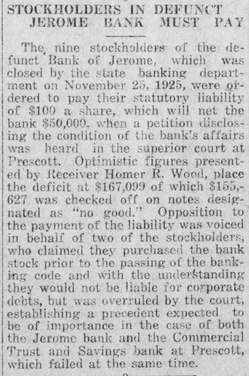 STOCKHOLDERS IN DEFUNCT JEROME BANK MUST PAY The nine stockholders of the defunct Bank of Jerome, which was closed by the state banking department on November 25, 1925, were ordered to pay their statutory liability of $100 a share, which will net the bank $50,000, when a petition disclosing the condition of the bank's affairs was heard in the superior court at Prescott. Optimistic figures presented by Receiver Homer R. Wood, place the deficit at $167,099 of which $155,627 was checked off on notes designated as "no good." Opposition to the payment of the liability was voiced in behalf of two of the stockholders, who claimed they purchased the bank stock prior to the passing of the banking code and with the understanding they would not be liable for corporate debts, but was overruled by the court, establishing a precedent expected to be of importance in the case of both the Jerome bank and the Commercial Trust and Savings bank at Prescott, which failed at the same time.