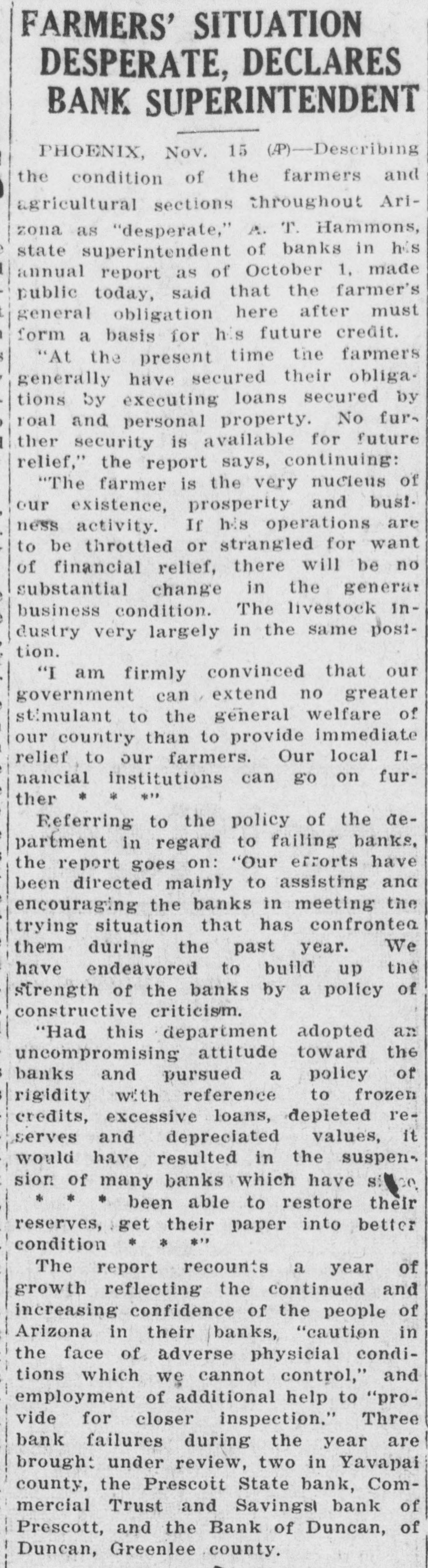 FARMERS' SITUATION DESPERATE, DECLARES BANK SUPERINTENDENT PHOENIX, Nov. 15 (R)-Describing the condition of the farmers and agricultural sections throughout Arizona as "desperate," P. T. Hammons, state superintendent of banks in his annual report as of October 1, made public today, said that the farmer's general obligation here after must form a basis for his future credit. "At the present time the farmers generally have secured their obligations by executing loans secured by roal and personal property. No further security is available for future relief," the report says, continuing: "The farmer is the very nucleus of our existence, prosperity and bust ness activity. If his operations are to be throttled or strangled for want of financial relief, there will be no substantial change in the generat business condition. The livestock industry very largely in the same posttion. "I am firmly convinced that our government can extend no greater stimulant to the general welfare of our country than to provide immediate relief to our farmers. Our local f1nancial institutions can go on further * *" Referring to the policy of the department in regard to failing banks, the report goes on: "Our efforts have been directed mainly to assisting ana encouraging the banks in meeting the trying situation that has confrontea them during the past year. We have endeavored to build up the strength of the banks by a policy of constructive criticism. "Had this department adopted an uncompromising attitude toward the banks and pursued a policy of rigidity with reference to frozen credits, excessive loans, depleted reserves and depreciated values, it would have resulted in the suspension of many banks which have stop been able to restore their reserves, get their paper into better condition The report recounts a year of growth reflecting the continued and increasing confidence of the people of Arizona in their banks, "caution in the face of adverse physicial conditions which we cannot control," and employment of additional help to "provide for closer inspection." Three bank failures during the year are brough: under review, two in Yavapai county, the Prescott State bank, Commercial Trust and Savingst bank of Prescott, and the Bank of Duncan, of Duncan, Greenlee county.