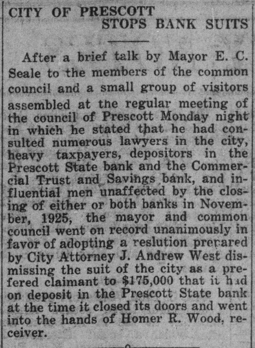 CITY OF PRESCOTT STOPS BANK SUITS After a brief talk by Mayor E. C. Seale to the members of the common council and a small group of visitors assembled at the regular meeting of the council of Prescott Monday night in which he stated that he had consulted numerous lawyers in the city, heavy taxpayers, depositors in the Prescott State bank and the Commercial Trust and Savings bank, and influential men unaffected by the closing of either or both banks in November, 1925, the mayor and common council went on record unanimously in favor of adopting a reslution prepared by City Attorney J. Andrew West dismissing the suit of the city as a prefered claimant to $175,000 that it had on deposit in the Prescott State bank at the time it closed its doors and went into the hands of Homer R. Wood, receiver.