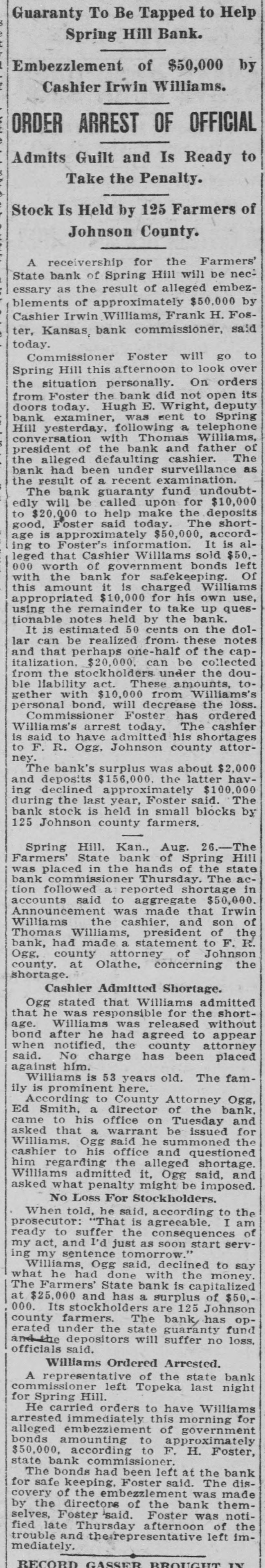Guaranty To Be Tapped to Help Spring Hill Bank. Embezzlement of $50,000 by Cashier Irwin Williams. ORDER ARREST OF OFFICIAL Admits Guilt and Is Ready to Take the Penalty. Stock Is Held by 125 Farmers of Johnson County. A receivership for the Farmers' of Hill will State bank Spring be necessary as the result of alleged embezblements of approximately $50,000 by Cashier Irwin Williams, Frank H. Foster, Kansas, bank commissioner, said today. Commissioner Foster will Hill look go to Spring this afternoon to over the situation personally. On orders the bank did not Hugh E. from bank doors Foster today. Wright, open deputy its examiner, was sent to Spring Hill yesterday, following a telephone conversation with Thomas Williams, president of the bank and father of the alleged defaulting cashier. The bank had been under surveillance as the result of a recent examination. The bank guaranty fund undoubtedly will be called upon for $10,000 to $20,000 to help make the deposits good, Foster said today. The shortage is approximately $50,000, according to Foster's information. It is alleged that Cashier Williams sold $50.000 worth of government bonds left with the bank for safekeeping Of this amount it is charged Williams appropriated $10,000 for his own use, using the remainder to take up questionable notes held by the bank. It is estimated 50 cents on the dollar can be realized from these notes and that perhaps one-half of the capitalization, $20,000. can be collected from the stockholders under the double liability act. These amounts, together with $10,000 from Williams's personal bond, will decrease Foster arrest today. The Williams's Commissioner has the ordered cashier loss. to have admitted his Ogg, Johnson to is said F. R. county shortages attorney. The bank's surplus was about $156,000. the and ing declined deposits latter $2,000 havapproximately $100,000 last year, is held in small by during bank stock the Foster said. blocks The 125 Johnson county farmers, Kan., Farmers' Spring Hill. Aug. 26.-The State bank of Spring Hill was placed in the hands of the state bank commissioner Thursday. The action followed a reported shortage in accounts said to aggregate $50,000. Announcement was made that Irwin Williams the cashier. and Williams, made a Thomas Ogg. bank, had statement president to of son F.R. the of county attorney of Johnson county. at Olathe, concerning the shortage. Cashier Admitted Shortage. Ogg stated that Williams admitted that he was responsible for the shortage. was released he had agreed to bond when after Williams notified, without appear the county attorney said. No charge has been placed against him. Williams is 53 years old. The family to County According is prominent here. Attorney Ogg, Ed Smith, a director of came his office on a warrant be asked to that Tuesday issued the bank. and for Ogg said he to his office and the cashier Williams him Williams. regarding alleged summoned questioned shortage. the admitted it, Ogg said, and asked what penalty might be imposed. No Loss For Stockholders. When told, he said, according to the prosecutor: "That is agreeable. I am ready to suffer the consequences of servmy act, and I'd just as soon start ing my sentence tomorrow.' Williams, Ogg said, declined to say what he had done with the money The Farmers' State bank is capitalized at $25,000 and has a surplus of stockholders are 125 The has county 000. erated Its under farmers. bank Johnson $50,- opthe state guaranty fund and the depositors will suffer no loss, officials said. Williams Ordered Arrested. A representative of the state bank commissioner left Topeka last night for Spring Hill. He carried orders to have Williams arrested immediately this morning for alleged embezziement of government bonds amounting to approximately $50,000. according to F. H. Foster, state bank commissioner. The bonds had been left at the bank for safe keeping, Foster said. The discovery of the embezzlement was made by the directors of the bank themselves, Foster said. Foster was notified late Thursday afternoon of the trouble and the/representative left immediately. RECORD GASSER BROUGHT IV