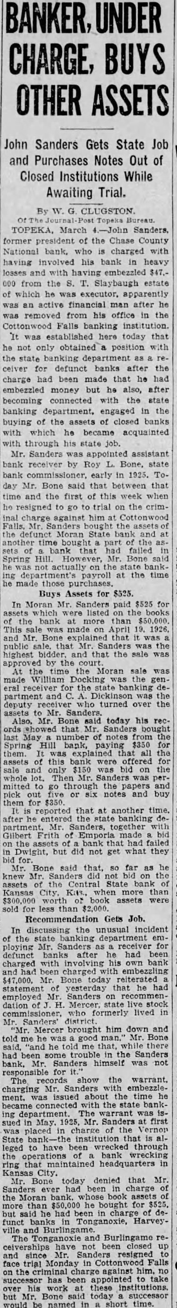 CHARGE, BUYS OTHER ASSETS John Sanders Gets State Job and Purchases Notes Out of Closed Institutions While Awaiting Trial. By CLUGSTON. former president of the Chase County National bank, charged with having involved his bank in heavy losses and with having embezzled $47.000 from the Slaybaugh estate which he was executor. apparently an active financial man after he removed from his office in the Cottonwood Falls banking institution. It established here today that not only obtained position with the state banking department ceiver defunct banks after charge had been made that he had embezzled money but he also, after becoming connected the state banking department. engaged in the buying the assets of closed banks with which he became acquainted through his state job. Mr. Sanders was assistant bank receiver by Roy Bone, state bank early in 1925. day Mr. Bone said that between that time and the first this week when he resigned go trial on the crimagainst him Moran State bank and the had failed Spring Mr. Bone on the state bankpayroll at the time made those purchases. Buys Assets for $525. In Moran Sanders paid $525 the bank more than This made April 1926, Mr. Bone that public sale, Sanders highest and that the sale by the At time the Moran sale made William Docking the genreceiver the banking partment and Dickinson was deputy turned over Mr. Sanders. Also, Mr. said today his that May number notes from Spring Hill bank, paying $350 them. explained that all assets this bank were offered and only bid whole Then Sanders was mitted through the papers or notes and them for reported that at another time. the Gilbert Frith the bank that had failed Dwight, but did get what they Bone said that, far as knew Mr. Sanders did bid assets the Central State bank Kansas City, when more than worth assets sold than $2,000. Recommendation Gets Job. In the unusual incident the state banking ploying Mr. Sanders as receiver defunct banks after he had been charged with involving his own bank and had been charged embezzling Mr. Bone today yesterday that he employed Sanders Mercer, stock dation who formerly lived in Sanders' Mercer brought him down and good Mr. Bone told that, there been trouble the Sanders bank, Sanders himself responsible The show the warrant. charging Sanders embezzlement. issued about the time he became connected with the state bankdepartment. The warrant in May. 1925, Mr. Sanders first placed charge State institution that leged have through bank the that headquarters in today denied that Mr. Mr. had been charge the book assets than he bought for said he had been charge of defunct Tonganoxie, Harveyand The Tonganoxie Burlingame ceiverships have been closed since Mr. trial Monday Falls the against been take work these Mr. Bone today successor would be named short time.