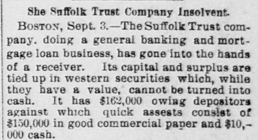 4 BOSTON TRUST COMPANY SUSPENDS. UNPROFITABLE WESTERN FARM MORTGAGES CAUSE THE TROUBLE. Boston, Sept. 3.-Judge Allen this morning granted an injunction against the Suffolk Trust Company, restraining the company from doing business, and ap pointed John Haskell Butler, of Boston, receiver. Mr. Butler stated this afternoon that all depositors would undoubtedly be paid in full; that the stockholders were liable, just as stockholders of National banks were, and could be assessed if the quick assets were not sufficient. The company had been warned by the Savings Bank Commissioners to pay no more money on the Western portion of their business. The. Western farm loans in Kansas have failed to satisfy expectations. The company has now on hand over $70,000 of foreclosures of Western mortgages, $10,000 of tax titles and $16,000 in mortgages which have not been sold. Its capital and surplus are tied up in Western securities. It has $162,000 owing to depositors, against which the quick assets consist of $150,000 in good commercial paper and some $10,000 in cash. The guaranteed mortgage coupons for September 1 have not been paid, owing to the orders of the commissioners, and the company's business has been suspended. The company is an offshoot of the Showalter Mortgage Company, which failed two years ago, and has been used largely as a depository for the funds of the lottery bond investment companies.