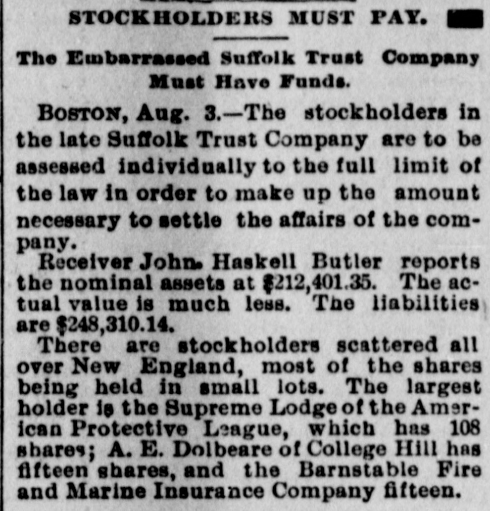 STOCKHOLDERS MUST PAY. The Embarrassed Suffolk Trust Company Must Have Funds. BOSTON, Aug. 3.-The stockholders in the late Suffolk Trust Company are to be assessed individually to the full limit of the law in order to make up the amount necessary to settle the affairs of the company. Receiver John. Haskell Butler reports the nominal assets at $212,401.35. The actual value is much less. The liabilities are $248,310.14. There are stockholders scattered all over New England, most of the shares being held in small lots. The largest holder is the Supreme Lodge of the American Protective League, which has 108 shares; A. E. Dolbeare of College Hill has fifteen shares, and the Barnstable Fire and Marine Insurance Company fifteen.