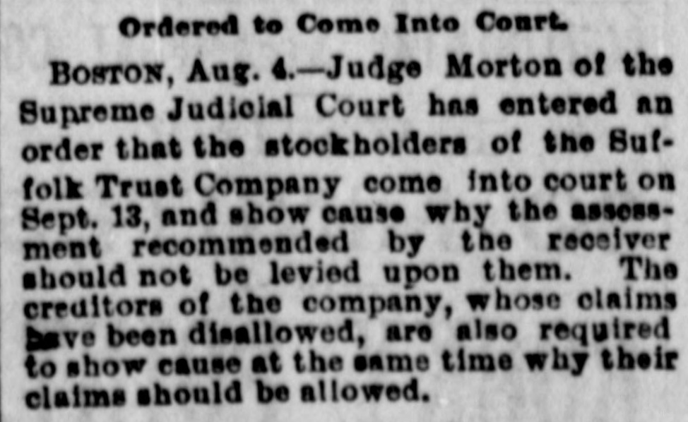 Ordered to Come Into Court. BOSTON, Aug. 4.-Judge Morton of the Supreme Judicial Court has entered an order that the stockholders of the Suffolk Trust Company come into court on Sept. 13, and show cause why the assessment recommended by the receiver should not be levied upon them. The creditors of the company, whose claims have been disallowed, are also required to show cause at the same time why their claims should be allowed.