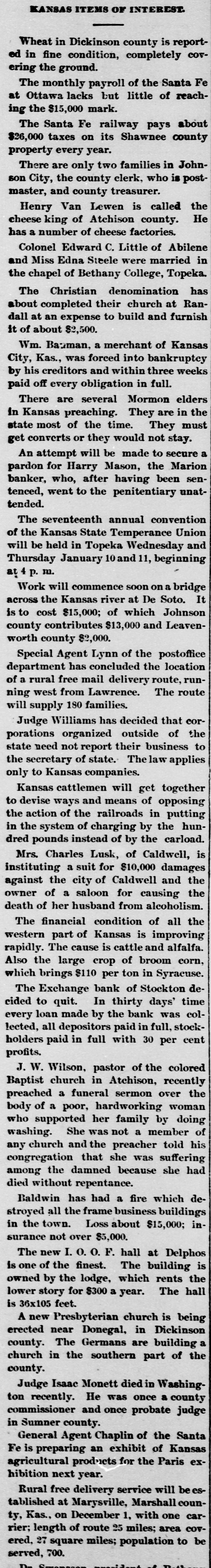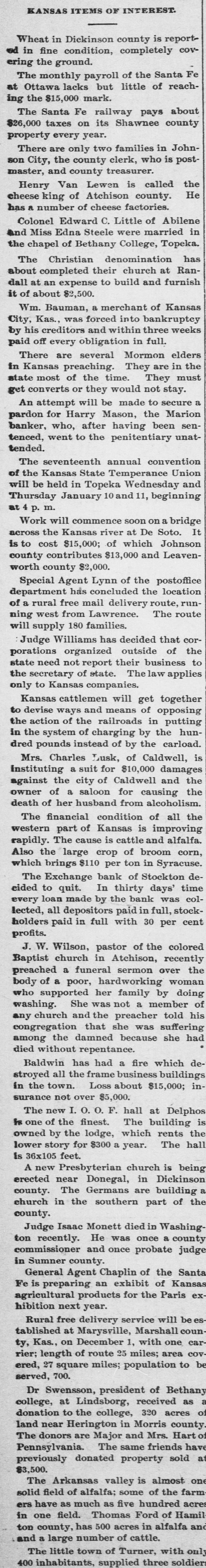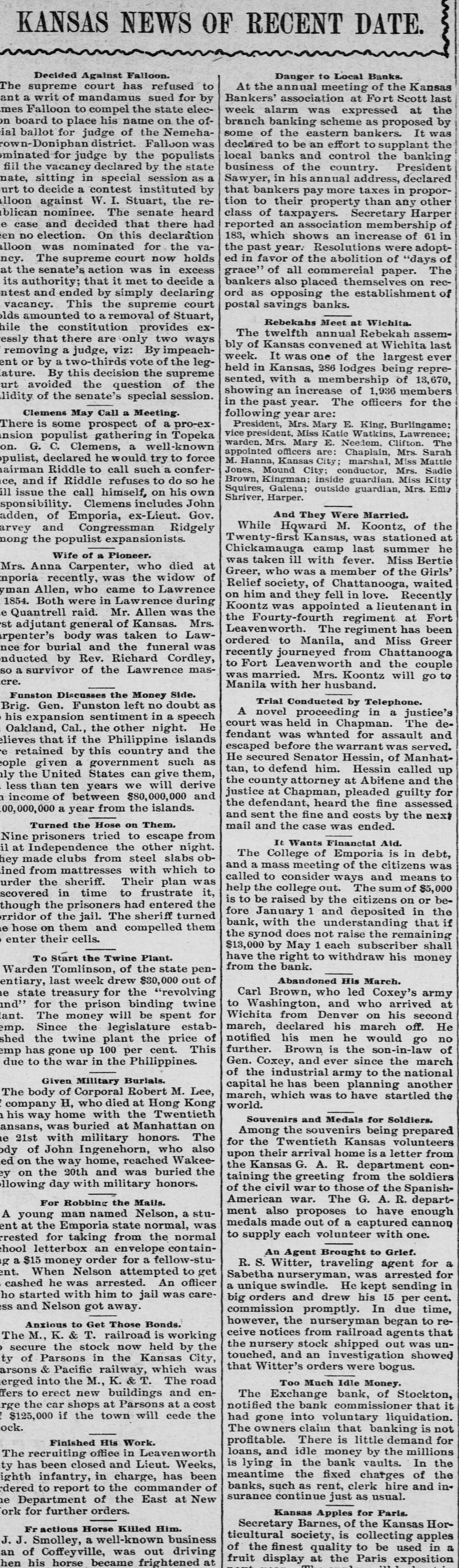 RECENT DATE. Danger to Local Banks. At the annual meeting of the Kansa Bankers' association at Fort Scott la week alarm was expressed at tl branch banking scheme as proposed b some of the eastern bankers. It wa declared to be an effort to supplant th local banks and control the bankin business of the country. Presider Sawyer, in his annual address, declare that bankers pay more taxes in propo tion to their property than any other class of taxpayers. Secretary Harp reported an association membership 183, which shows an increase of 61 i the past year. Resolutions were adop in favor of the abolition of "days grace" of all commercial paper. Th bankers also placed themselves on re as opposing the establishment o postal savings banks. Rebekahs Meet at Wichita. The twelfth annual Rebekah assen bly of Kansas convened at Wichita la week. It was one of the largest eve held in Kansas, 286 lodges being repr sented, with a membership of 13,67 showing an increase of 1,936 member in the past year. The officers for th following year are: President, Mrs. Mary E. King, Burlingam vice president, Miss Katie Watkins, Lawrenc warden, Mrs. Mary E. Needem, Clifton. TI appointed officers are: Chaplain, Mrs. Sara M. Hanna, Kansas City; marshal, Miss Matt Jones, Mound City; conductor, Mrs. Sad Brown, Kingman; inside guardian. Miss Kit Squires, Galena; outside guardian, Mrs. Ef Shriver, Harper. And They Were Married. While Howard M. Koontz, of tl Twenty-first Kansas, was stationed Chickamauga camp last summer 1 was taken ill with fever. Miss Bert Greer, who was a member of the Girl Relief society, of Chattanooga, waite on him and they fell in love. Recent Koontz was appointed a lieutenant the Fourty-fourth regiment at Fo Leavenworth. The regiment has bee ordered to Manila, and Miss Gre recently journeyed from Chattanoog to Fort Leavenworth and the coup was married. Mrs. Koontz will go Manila with her husband. Trial Conducted by Telephone. A novel proceeding in a justice court was held in Chapman. The d fendant was wanted for assault an escaped before the warrant was serve He secured Senator Hessin, of Manha tan, to defend him. Hessin called 1 the county attorney at Abilene and tl justice at Chapman, pleaded guilty f the defendant, heard the fine assesse and sent the fine and costs by the ne: mail and the case was ended. It Wants Financial Aid. The College of Emporia is in deb and a mass meeting of the citizens wa called to consider ways and means help the college out. The sum of $5,00 is to be raised by the citizens on or b fore January 1 and deposited in th bank, with the understanding that the synod does not raise the remainin $13,000 by May 1 each subscriber sha have the right to withdraw his mone from the bank. Abandoned His March. Carl Brown, who led Coxey's arm to Washington, and who arrived Wichita from Denver on his secor march, declared his march off. E notified his men he would go I further. Brown is the son-in-law Gen. Coxey, and ever since the mar of the industrial army to the nation capital he has been planning anoth march, which was to have startled tl world. Souvenirs and Medals for Soldiers. Among the souvenirs being prepar for the Twentieth Kansas voluntee upon their arrival home is a letter fro the Kansas G. A. R. department co taining the greeting from the soldie of the civil war to those of the Spanis American war. The G. A. R. depar ment also proposes to have enoug medals made out of a captured canno to supply each volunteer with one. An Agent Brought to Grief. R. S. Witter, traveling agent for Sabetha nurseryman, was arrested f a unique swindle. He kept sending big orders and drew his 15 per cen commission promptly. In due tim however, the nurseryman began to r ceive notices from railroad agents th the nursery stock shipped out was u touched, and an investigation show that Witter's orders were bogus. Too Much Idle Money. The Exchange bank, of Stockto notified the bank commissioner that had gone into voluntary liquidatio The owners claim that banking is n profitable. There is little demand f loans, and idle money by the million is lying in the bank vaults. In tl meantime the fixed charges of tl banks, such as rent, clerk hire and i surance continue just as usual. Kansas Apples for Paris. Secretary Barnes, of the Kansas Ho ticultural society, is collecting appl of the finest to