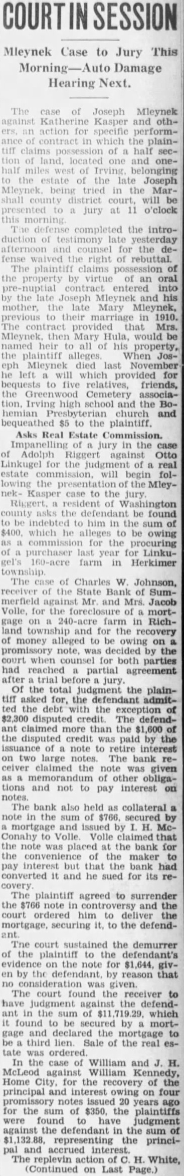 Case to Jury Damage Hearing Next. The case of Joseph Mleynek against Katherine Kasper and action for specific in which the claims possession of half of land, located and half miles west of Irving. belonging the estate of the late Joseph being tried in the Marshall county district court, will be jury at o'clock completed the introduction of testimony late yesterday afternoon and counsel for the fense waived the right of rebuttal The plaintiff claims possession the property by virtue of oral contract entered into Joseph Mleynek and his late Mary Mleynek, their marriage in Mleynek. then Mary Hula, would named heir all his plaintiff alleges. When Mleynek died last November will which provided bequests five relatives, friends, Cemetery tion. Irving high school and the hemian church and $5 to the plaintiff. Asks Real Estate Commission. Impanelling jury in the Adolph Riggert against Otto Linkugel for the judgment of estate will begin the the Kasper the Riggert. resident of Washington defendant found indebted him in the $400. which alleges to owing for the purchaser last year for Linku160-acre farm in Herkimer township. The of Charles W Johnson, receiver the State Bank of merfield and Mrs. Jacob Volle, for the foreclosure of on 240-acre farm in Richland township and for the recovery of money alleged to be owing promissory note, was decided by the when counsel for both parties had reached partial agreement trial before Of the total judgment the plainasked for, the defendant the the exception $2,300 disputed credit. The claimed more than the the disputed credit paid by the of note to retire interest on two large notes. The bank ceiver claimed the note was given of other obligations and not to interest pay The bank also held as collateral note in the sum of $766. secured mortgage and issued by Conahy Volle. Volle claimed that the note was placed the bank the convenience of the maker pay interest but that the bank had converted it and he sued for its The plaintiff agreed to surrender the $766 note in and the court ordered him to deliver the mortgage, securing it, the defendant. The court sustained the demurrer of the plaintiff to the defendant's evidence the note for en by defendant, by reason that consideration was given. The court found the receiver to have judgment against the defendant in the sum of which found to be secured mortgage and declared the mortgage third lien. Sale of the real tate was ordered. In the case of William and William Home City for the recovery of the principal and interest owing on four promissory notes ago for the the were have judgment against the defendant in the representing the principal and accrued interest. The replevin action of White, (Continued on Last