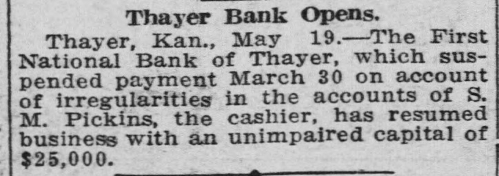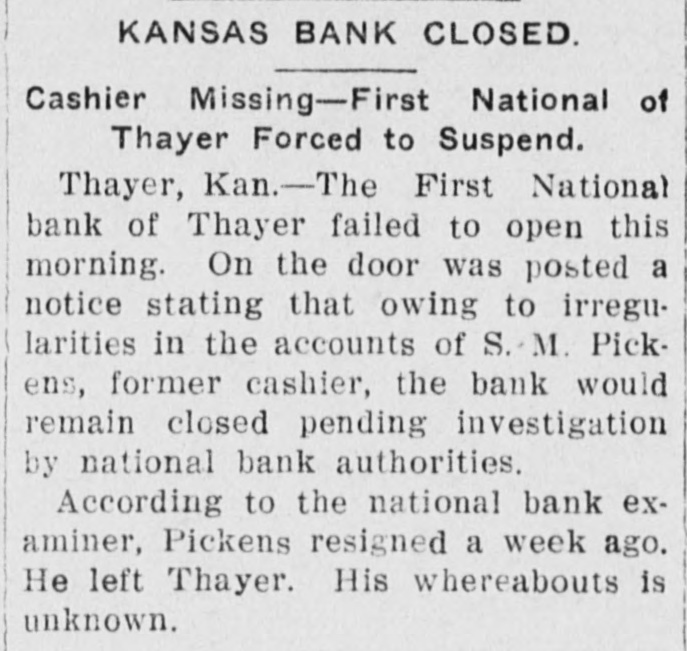 KANSAS BANK CLOSED. Cashier Missing-First National of Thayer Forced to Suspend. Thayer, Kan.-The First National bank of Thayer failed to open this morning. On the door was posted a notice stating that owing to irregularities in the accounts of S.M. Pickens, former cashier, the bank would remain closed pending investigation by national bank authorities. According to the national bank examiner, Pickens resigned a week ago. He left Thayer. His whereabouts is unknown.