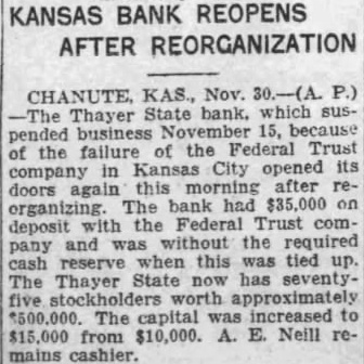 directors of the Thayer State bank in Neosho county had closed their bank's institution because large part of this reserves was up the closed City. Federal Trust company in Kansas The State bank was capitalized at $10,000. surplus of $5,000. had deposits of loans $120,000. operating under the Kansas guaranty R. Hoyt president and Neill cashier.