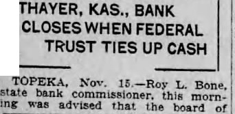 THAYER, KAS., BANK CLOSES WHEN FEDERAL TRUST TIES UP CASH Nov. L. Bone, state bank this morning was advised that the board of