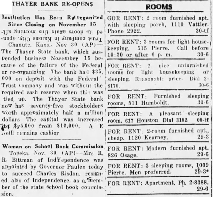 THAYER BANK RE-OPENS Institution Has Been d'organized GOR RENT: 2 room furnished apt. Since Closing on November 15 with sleeping porch, 1110 Vattier. Phone 2922. 30-tf Trust company in Kansas City openFOR RENT: rooms for light houseChanute. Kans.. Nov 30 keeping, 515 Pierre. Call before The Thayer State bank, which susor after m. 30-6 Pended business November 15 because of the failure of the Federal FOR RENT: nice unfurnished er re-organizing The bank ha $35, 100ms for light housekeeping or 000 on deposit with the Federal sleeping. Reasonable price. Dial Trust company and was without the 8170. 30-6 required cash reserve when this was FOR RENT: Furnished sleeping tied up. The Thnyer State bank 511 Humboldt. 30-6 rooms, now has seventy-five stockholders worth approximately half million RENT: A pleasant sleeping FOR dollars The capital was increased room. 617 Houston. Dial 3182. 00-tf 11 $y5,000 from $10,000. A E FOR RENT 2-room furnished apt., Neill remains cashier 29-3 Woman on School Book Commission FOR RENT: Modern furnished apt. Topeka. Nov. 30 R. 29-6 826 Osage. R. Bittman of IndYependence was FOR RENT: 3 sleeping rooms, 1009 appointed by Governor Paulen today 29-3* to succeed Charles Risdon. resign- Pierre. Men preferred. ed. also of Independence. as memFOR RENT: Apartment. Ph. 2-8388. ber of the state school book commis29-6 sion.