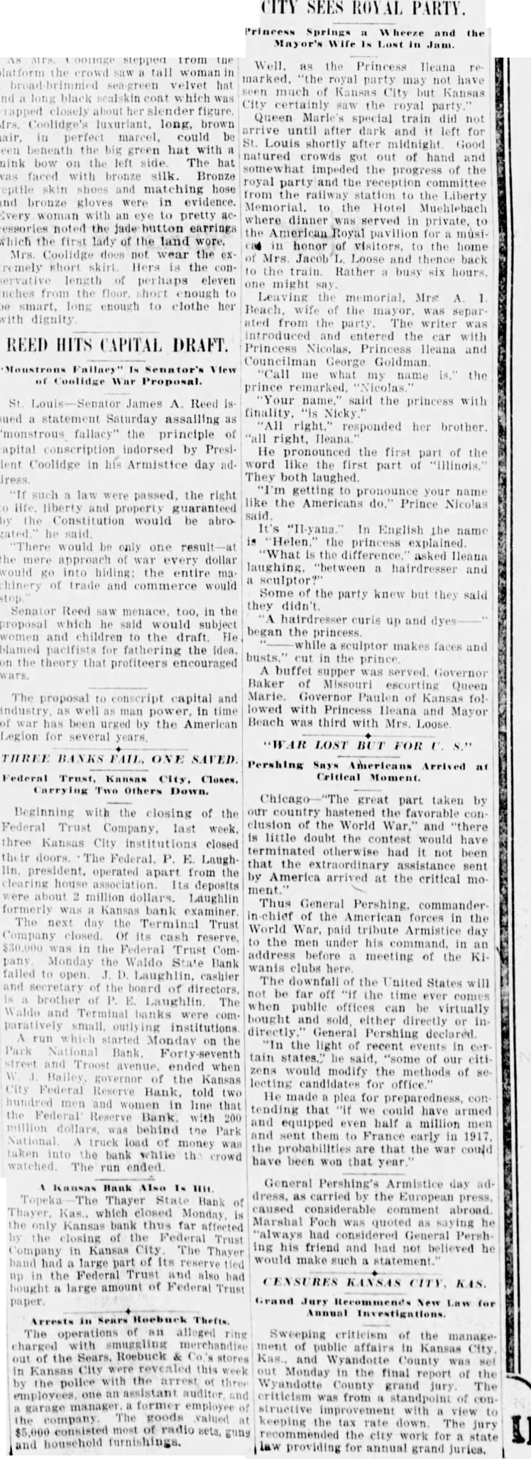 CITY SEES ROY AL PARTY. Princess Springs Wheeze and the Wife Lost Jam. Well. as Princess Ileana marked. "the royal party not have seen much Kansas but Kansas City certainly the royal party Queen Marie's train did not arrive until after dark left for St. Louis shortly after midnight Good natured crowds got out of hand and somewhat impeded the progress of the royal party the committee from the the Liberty to the Hotel where dinner was served in to American Royal for musiin honor of the home Jacob and back Rather busy six hours one might say Leaving the Mrs A Beach the mayor separ ated from the party. writer was introduced and entered the car with reed HITS CAPITAL DRAFT. Princess Nicolas. Princess lleana and Councilman George Goldman "Call what my name the Coolidge War Proposal. prince remarked Your name, said the princess with St. James A. Reed is "is sued statement Saturday assalling as right responded her brother 'monstrous fallacy' the principle of "all Heana capital indorsed by PresiHe pronounced the first part of the dent Coolidge in his Armistice day ad- word like the part "Illinois. They both laughed. dress "If such law were passed, the right like the Americans do. Prince Nicolas to life property guaranteed said by the Constitution would be abro It's English the name is Helen. the princess explained would be only one result 'What the difference asked the dollar laughing. "between hairdresser and go the entire sculptor?" chinery of trade and would Some of the party knew but they said they Senator Reed saw menace too, in the hairdresser curis up and proposal which said subject began the princess. women children the draft He while sculptor makes faces and blamed fathering the idea. busts.' cut in the prince on the theory that profiteers encouraged buffet supper was served. Governor wars. Baker Missouri Queen The proposal conscript capital and Marie Paulen of Kansas fol well power. in time lowed with Heana and Mayor of war has been urged by the American Beach was third with Mrs. Loose Legion for several THREE BANKS FAIL. ONE SAVED Federal Kansas City, Closes. Down. Beginning the closing of the Federal Trust last week. three Kansas institutions closed doors. The P. E. Laugh Iin operated apart from the deposits million Laughlin bank examiner The day the Terminal Trust Company its $30,000 was the Federal Trust Monday the Waldo State Bank cashier and secretary of the brother of E. The Waldo and banks paratively institutions run started Monday on the Park Bank and avenue. ended when governor of the Kansas City Federal Reserve Bank, told two and women in line that the Bank with 200 behind Park National was taken the bank th crowd watched. The run ended. The Thayer Bank Thayer. Kas., Monday is the only Kansas bank thus far affected by the closing of the Trust Company in Kansas City The Thayer large part its tied up the Federal Trust and also had bought large amount of Federal Trust paper. in Sears Roebuck Thefts The of an alleged out of the Roebuck in Kansas revealed this week the police with the arrest three employees. assistant auditor and garage manager former employee the company The goods valued $5,000 consisted of sets, gung and household furnishings. "WAR LOST BUT FOR U Critical Moment. Chicago- great part taken by our country the favorable clusion the World War," and 'there is little doubt the contest would have terminated had it not been that the assistance sent by America arrived at the critical moThus General Pershing. commander chief the American forces in the World War, paid tribute Armistice day to the under his command. in an address before meeting of the KIclubs here The the United States will not be far off "if the comes when public virtually bought and sold either or indirectly General Pershing "In the light recent in cer tain states.) of our citizens would modify the of se lecting candidates for office. He made plea for preparedness, tending that "if could have armed and equipped even half million men and sent to France early in 1917. the probabilities are that the war could been won that year General Pershing's Armistice day address. carried the European caused considerab abroad Marshal Foch was as he "always had Persh ing his friend and had not believed he would statement. KANSAS Grand Recommends New Law for Annual Investigations. Sweeping criticism of the management of affairs in Kansas City Kas. and Wyandotte County was set out Monday in the final of the Wyandotte County grand jury The criticism was from standpoint of onstructive improvement with to keeping the tax rate down. The jury the city work for law providing for annual grand juries.