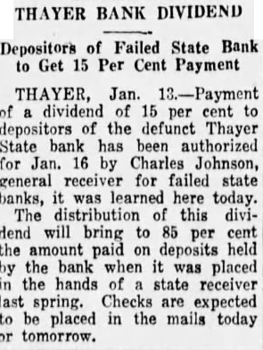 THAYER BANK DIVIDEND Depositors of Failed State Bank to Get Per Cent Payment THAYER, Jan. dividend of per cent depositors the defunct Thayer State bank has been authorized for by Charles Johnson, general receiver for failed state banks, was learned here today. distribution this dividend bring to 85 per the amount paid deposits the bank when was placed the hands state receiver spring. Checks expected placed in the mails today tomorrow.