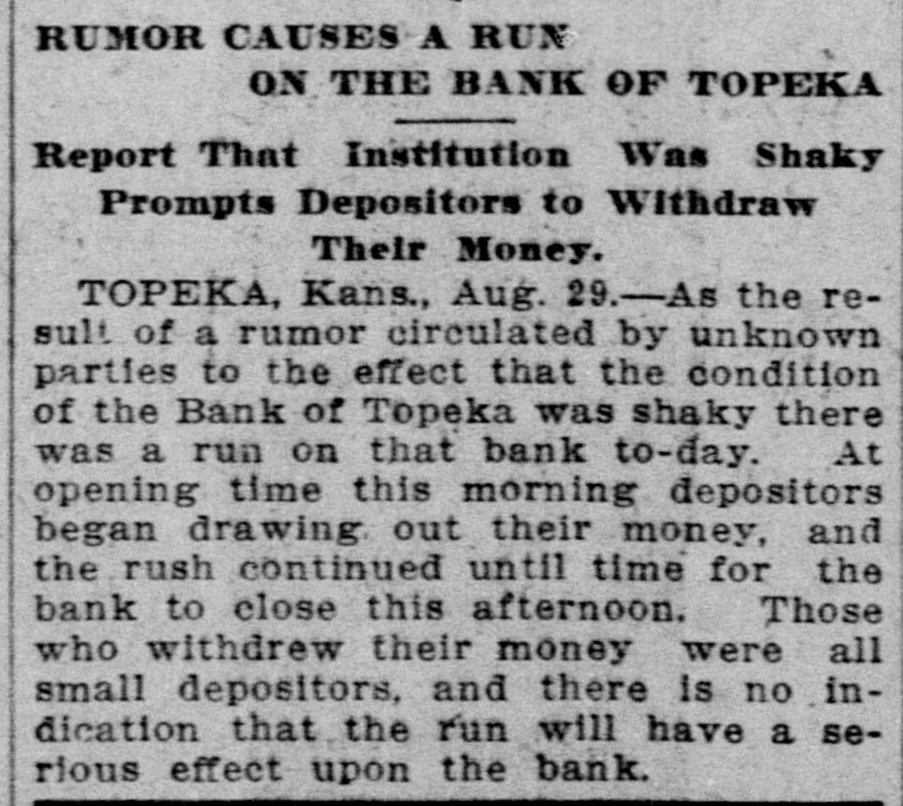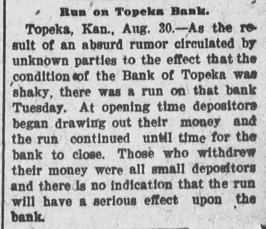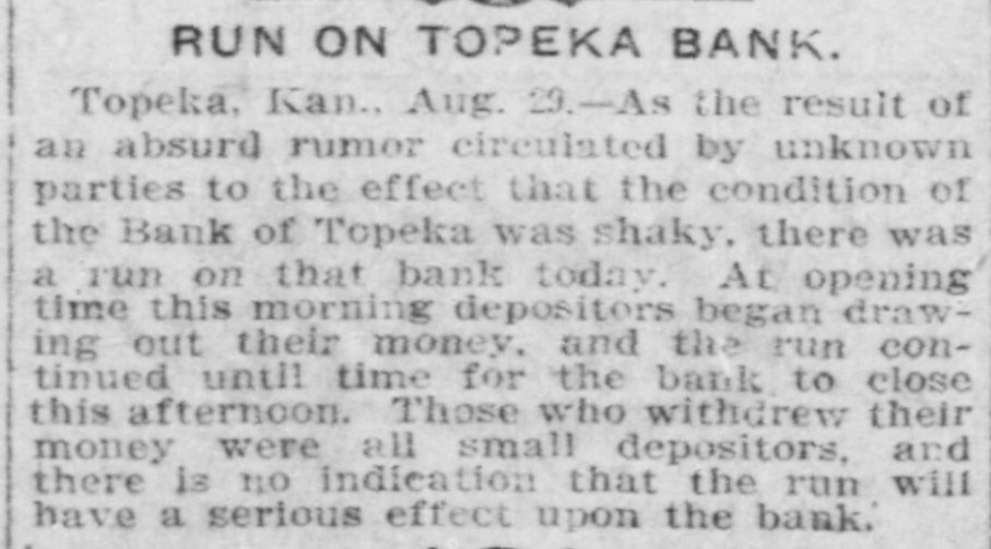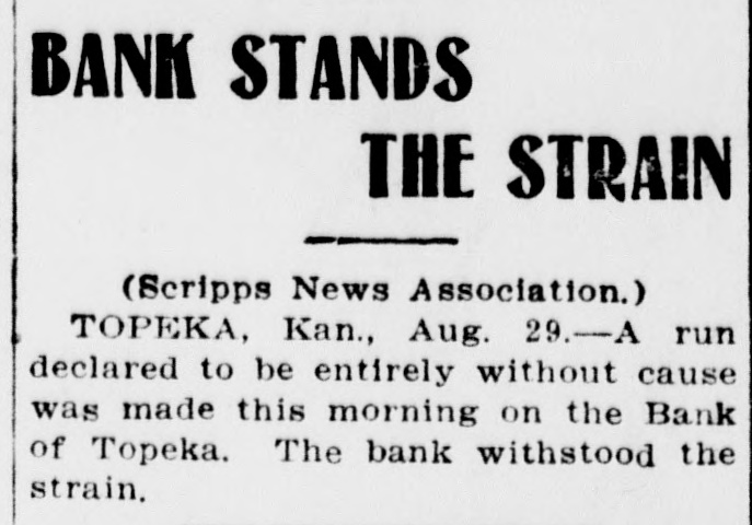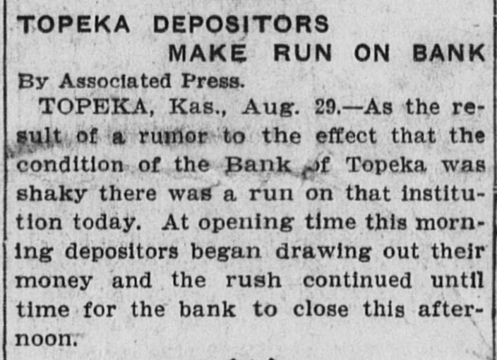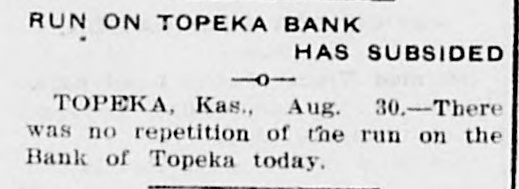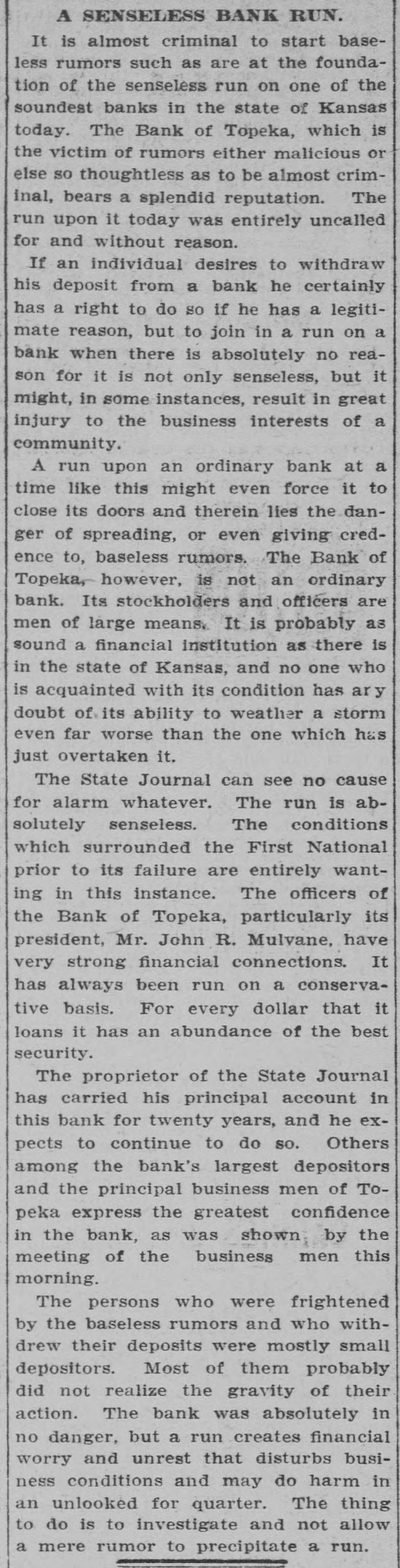 TOPEKA BANK SHUTS DOOR LARGE LOANS TO ONE MAN. C. J. Devlin, One of the Wealthiest Men in Kansas City, Involved. Topeka, Kan., July 3.-The First National Bank of Topeka, of which C. J. Devlin is the principal stockholder, failed to open its doors to-day. The government officials are making an examination of the bank's affairs, but gave out no statement to-day. On the door of the bank appeared this notice: This bank is closed by orders. The Controller of the Currency has been communicated with and will send an examiner, who will make a statement. W. H. ROSSINGTON, Vice-President. No definite statement was obtainable to-day regarding the condition of the First National Bank, controlled by Charles J. Devlin, a wealthy coal mine owner, which closed its doors this morning. Colonel W. H. Rossington, vice-president of the bank. locked the institution's books in the vault to await the arrival of J. T. Bradley, national bank examiner, whom the Controller had appointed receiver of the failed bank. Colonel Rossington would only say: "The bank's trouble has not been caused by dishonesty on the part of any one, but by lending too largely to one borrower. There has been no stealing." The borrower, it is said, is Mr. Devlin, and the bank is said to hold the capitalist's paper to the amount of $1,000,000. Mr. Devlin, whose sudden illness brought about the tangle in the big coal minrailroad valued, at close to $7,000,000. is still under care ing and properties, it the is estimated, from of a physician, and no statement can be obtained him. All that came from his home to-day was that coal had over in life insurance the bank stricken nearly $700,000 operator turned and about to the the same amount in Topeka real estate. Business associates of Mr. Devlin expressed their opinion that if properly handled this would allow the bank to pay out. Aside from the temporary flurry that the failure of the First National Bank caused on the other banks of the city, the most interesting phase of the situation was the statement of the State Treasurer, T. T. Kelly, that the bank held $547,000 of the State's funds. Mr. Devlin was one of the Mr. Kelly's bondsmen. Following the announcement of the failure, a lively but not disastrous run was started on the Central National Bank. Other runs of a lesser degree were started on the State Savings Bank, the Bank of Topeka and on the Merchants' National Bank. At none of these banks, however, was the demand for withdrawals great. Following the closing of the First National Bank there was a slight run on the Central National Bank, in which Mr. Devlin also is a large stockholder, and there were small runs later in the day on the Merchants' National Bank, the Bank of Topeka and the State Savings Bank. At each of these institutions all depositors who requested their money were paid and confidence was expressed in the ability to meet any demands of the depositors. Cash to the amount of $300,000 was deposited in the Central National to offset the run. J. W. Gleed stated that $700,000 worth of real estate -$300,000 unencumbered Topeka property, the other $400,000 in coal lands in Southeastern Kansas-had been turned in by Mr. Devlin, together with $700,000 life insurance. Mr. Gleed asserted that the Central National was in a perfectly solvent condition. He further stated that nothing more would be done with the Missouri organization of the Devlin property until after the report of the Controller here. In the First National Bank the State of Kansas has over $500,000 in deposits, the city of Topeka. $39,000, and the county of Shawnee about $30,000. Mr. Devlin, who has been under the care of a physician, was unable to leave his home to-day. He was up and around, however. He was in the best of spirits, and in reply to questions, said that he expected to be able to go to the bank in another week.