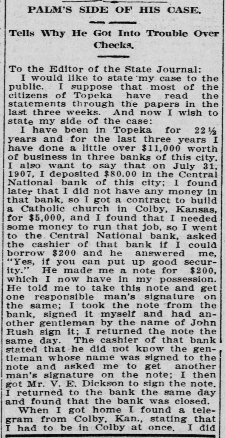 PALM'S SIDE OF HIS CASE. Tells Why He Got Into Trouble Over Checks, To the Editor of the State Journal: I would like to state 'my case to the public. I suppose that most of the citizens of Topeka have read the statements through the papers in the last three weeks. And now I wish to state my side of the case: I have been in Topeka for 22 1/2 years and for the last three years I have done a little over $11,000 worth of business in three banks of this city. I also want to say that on July 31, 1907, I deposited $80.00 in the Central National bank of this city; I found later that I did not have any money in that bank, so I got a contract to build a Catholic church in Colby, Kansas, for $5,000, and I found that I needed some money to run that job, so I went to the Central National bank, asked the cashier of that bank if I could borrow $200 and he answered me, "Yes, if you can put up good security." He made me a note for $200, which I now have in my possession. He told me to take this note and get one responsible man's signature on the same; I took the note from the bank, signed it myself and had another gentleman by the name of John Rush sign it; I returned the note the same day. The cashier of that bank stated that he did not know the gentleman whose name was signed to the note and asked me to get another man's signature on the note; I then got Mr. V. E. Dickson to sign the note. I returned to the bank the same day and found that the bank was closed. When I got home I found a telegram from Colby, Kan., stating that I had to be in Colby at once. I did