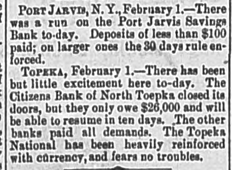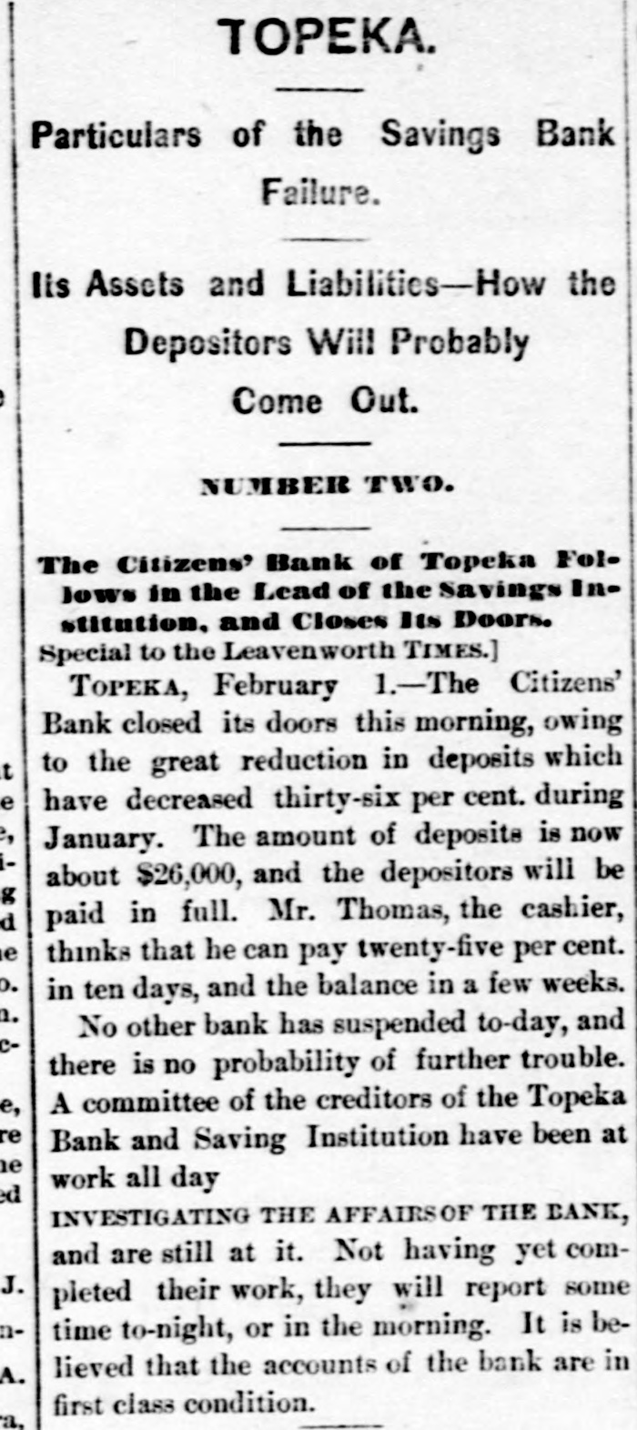 TOPEKA. Particulars of the Savings Bank Failure. Its Assets and Liabilities-How the Depositors Will Probably Come Out. NUMBER TWO. The Citizens' Bank of Topeka Follows in the Lead of the Savings Institution, and Closes Its Doors. Special to the Leavenworth TIMES.] TOPEKA, February 1.-The Citizens' Bank closed its doors this morning, owing to the great reduction in deposits which have decreased thirty-six per cent. during January. The amount of deposits is now about $26,000, and the depositors will be g d paid in full. Mr. Thomas, the cashier, e thinks that he can pay twenty-five per cent. 0. in ten days, and the balance in a few weeks. 1. No other bank has suspended to-day, and & there is no probability of further trouble. A committee of the creditors of the Topeka Bank and Saving Institution have been at e work all day d INVESTIGATING THE AFFAIRSOF THE BANK, and are still at it. Not having yet comJ. pleted their work, they will report some time to-night, or in the morning. It is believed that the accounts of the bank are in first class condition.