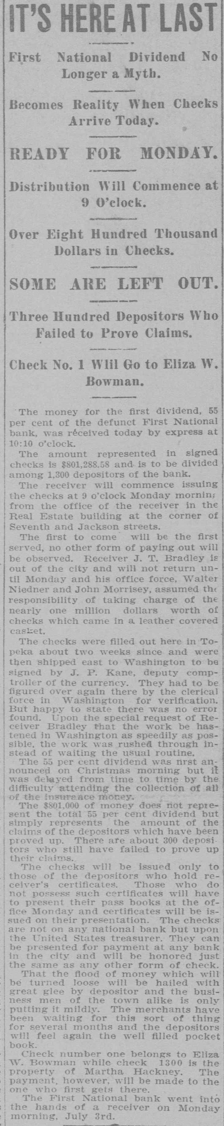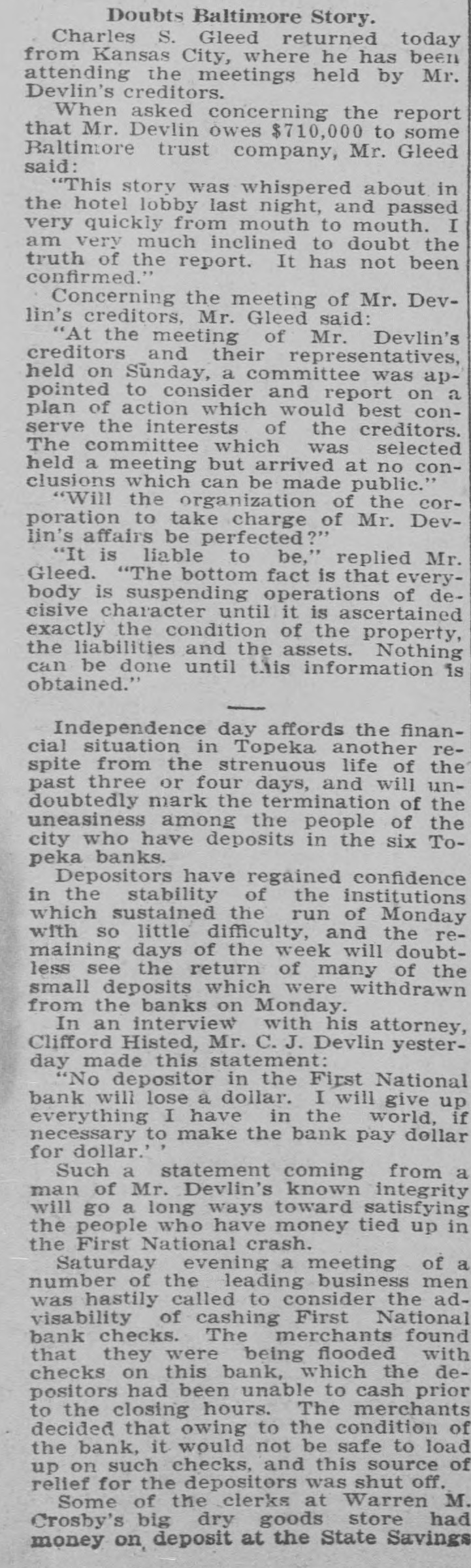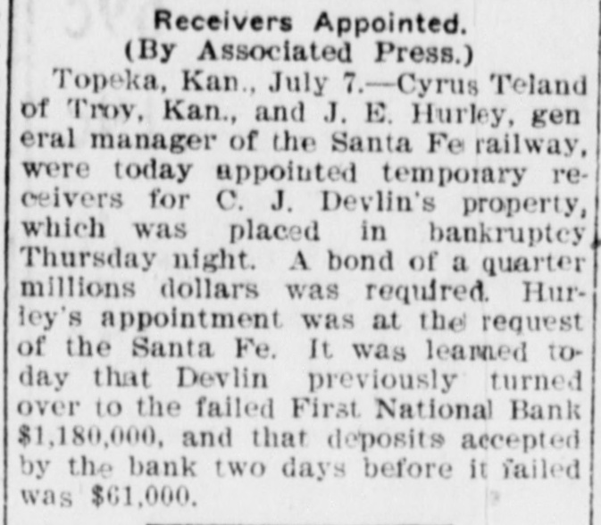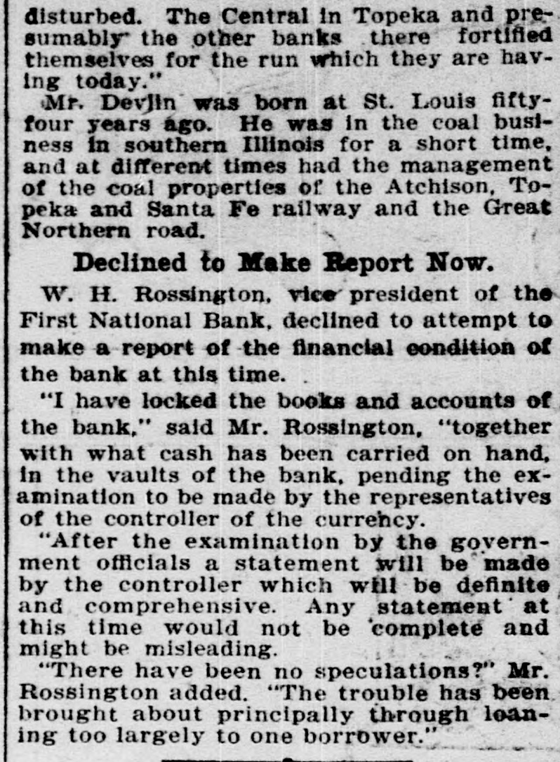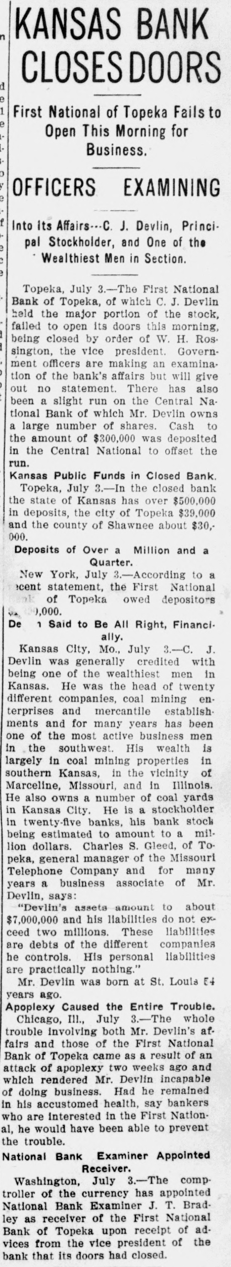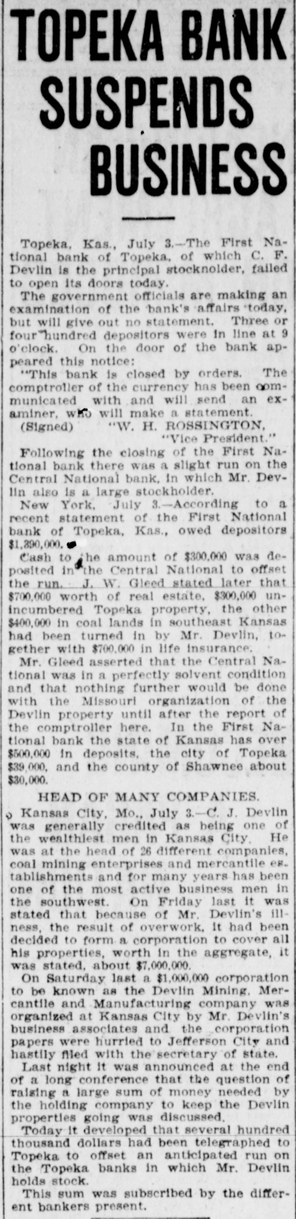 Depositors Waited in Vain for Doors to Open. Notice Posted at Five Minutes Before Nine. SIGNED BY ROSSINGTON Comptroller of the Currency Has Been Notified. C.J. Devlin Turns Topeka Property Over to Bank. WHY THEY GAVE UP. Could Not Raise Enough Money to Meet Demands. Claimed Depositors Will Be Paid in Full. National Examiner Bradley Is Appointed Receiver. At five minutes before 9 o'clock this morning, the following typewritten notice was posted on the front door of the First National bank: "This bank is closed by my order. The comptroller of the currency has been communicated with, and will send examiner who will make a statement. W. H. ROSSINGTON, ice President." "Topeka, Kan.. July 3, 1903." Washington, July 3.-The comptroller of the currency has appointed National Bank Examiner J. T. Bradley receiver of the First National bank. Topeka, Kas., upon receipt of advices from the vice president of the bank that its doors had been closed. A crowd of three or four hundred people, many of whom were depositors, read this notice and quietly dispersed. There was no great amount of excitement. As early as 8 o'clock this morning, it was evident that the First National was in for a run. People began to line up in front of the building, and three or four policemen were detailed to keep the crowd in order. Through the front windows the crowd could see the bank employes and some of the officials walk. ing about in the rear room. There was no evidence of any intention to open the doors. There were no books on the desks, no money in sight and no bustle of preparation to pay off the depositors. Hence the rumor was prevalent through the crowd that the bank would not open for business, and no particular surprise was expressed when the notice was actually posted. About one-third of the crowd at the First National bank was composed of women. The women took the situation with as much composure as did the men, however, and there was no weeping when the notice went up. While the crowd was collecting in front of the First National a smaller crowd assembled on the steps of the Central National. The Central National opened promptly for business. and the rush of depositors was quickly paid off. The people at the Central National who withdrew their money seemed to be mostly savings depositors. There was also considerable of a flurry at the Bank of Topeka. At the Merchants' National bank there were but few people doing any business. At the State Savings there was a small gathering. The North Topeka banks were not affected. The fact that the Monday morning business is usually heavier than other mornings of week served to scare a few timid depositors into the idea that a run was in progress. Depositors May Be Paid. It is claimed, however, at this time that the bank is fully solvent and that the creditors will be paid in full. The closing of the bank hinged upon the inability of the Topeka banks to extend enough aid in addition to the refusal of the banks in Kansas City, Missouri, to come to the rescue of the First National. The Central National bank and the Bank of Topeka both stood ready to help but on condition that the Kansas City banks should extend aid. A wire was received by the First National bank from Kansas City stating their inability to come to the rescue. The answer was terse and no particular interpretation of the refusal could be construed. At eight o'clock the crowds commenced to loiter around in the vicinity of the First National and across the street from vantage points where operations could be viewed In the crowds were curiosity seekers as well as interested depositors. At 8:15 there were some 15 patrons of the bank waiting for the doors to open and at nine o'clock this number had been increased to fully 175. They hung around and pressed forward to the doors until at nine o'clock the statement made by W H. Rossington, director and vice president of the bank. was affixed to the door. Anxious faces pressed close up to the glass dcors to read the statement and then turned away. The press continued The and at 9:30 gradually grew less. people took the statement philosophically and with as much optimism as could be expected. Few words indicative of chagrin or grief were made and the remarks were simply passing in their nature. The groups was divided among the large and small patrons alike. The face of the large as well as the small depositor was seen in the press. One man had $15,000 and but few feet away was small bootblack with savings of a few dollars. Could Not Save Bank. The holding corporation which was to take over the properties of Mr. Devlin will be permitted to lapse. The corporation which was to be established primarily to save the First National bank will be suffered to lapse unless it is found on further examination that it is best to establish such an organization. Mr. J. W. Gleed, who