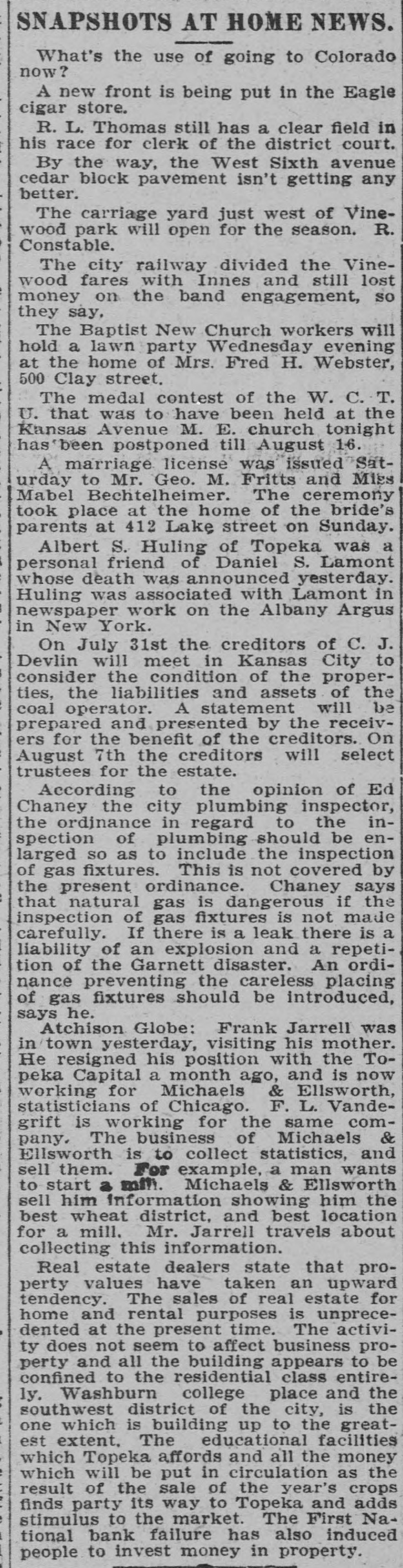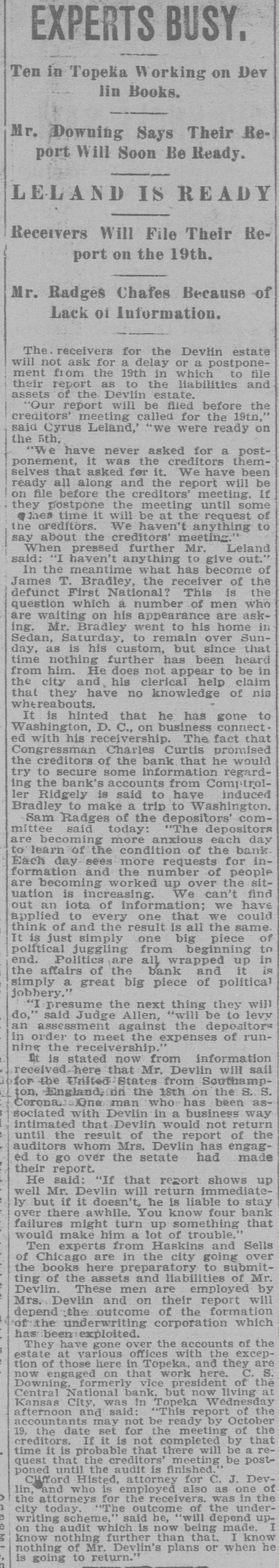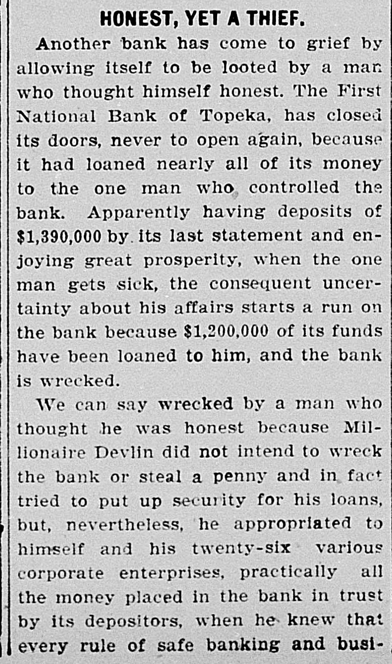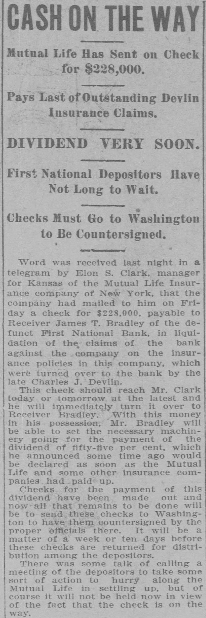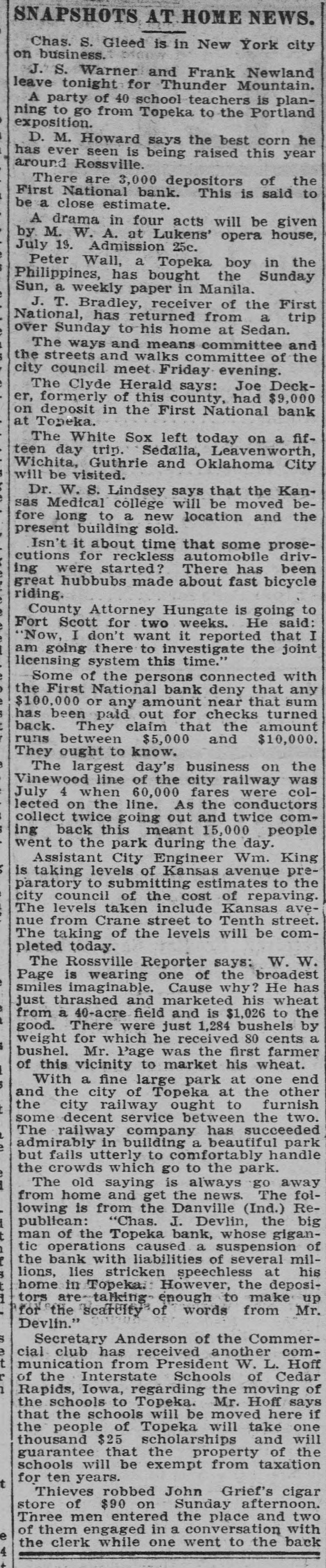 Depositors Waited in Vain for Doors to Open. Notice Posted at Five Minutes Before Nine. SIGNED BY ROSSINGTON Comptroller of the Currency Has Been Notified. C.J. Devlin Turns Topeka Property Over to Bank. WHY THEY GAVE UP. Could Not Raise Enough Money to Meet Demands. Claimed Depositors Will Be Paid in Full. National Examiner Bradley Is Appointed Receiver. At five minutes before 9 o'clock this morning, the following typewritten notice was posted on the front door of the First National bank: "This bank is closed by my order. The comptroller of the currency has been communicated with, and will send examiner who will make a statement. W. H. ROSSINGTON, ice President." "Topeka, Kan.. July 3, 1903." Washington, July 3.-The comptroller of the currency has appointed National Bank Examiner J. T. Bradley receiver of the First National bank. Topeka, Kas., upon receipt of advices from the vice president of the bank that its doors had been closed. A crowd of three or four hundred people, many of whom were depositors, read this notice and quietly dispersed. There was no great amount of excitement. As early as 8 o'clock this morning, it was evident that the First National was in for a run. People began to line up in front of the building, and three or four policemen were detailed to keep the crowd in order. Through the front windows the crowd could see the bank employes and some of the officials walk. ing about in the rear room. There was no evidence of any intention to open the doors. There were no books on the desks, no money in sight and no bustle of preparation to pay off the depositors. Hence the rumor was prevalent through the crowd that the bank would not open for business, and no particular surprise was expressed when the notice was actually posted. About one-third of the crowd at the First National bank was composed of women. The women took the situation with as much composure as did the men, however, and there was no weeping when the notice went up. While the crowd was collecting in front of the First National a smaller crowd assembled on the steps of the Central National. The Central National opened promptly for business. and the rush of depositors was quickly paid off. The people at the Central National who withdrew their money seemed to be mostly savings depositors. There was also considerable of a flurry at the Bank of Topeka. At the Merchants' National bank there were but few people doing any business. At the State Savings there was a small gathering. The North Topeka banks were not affected. The fact that the Monday morning business is usually heavier than other mornings of week served to scare a few timid depositors into the idea that a run was in progress. Depositors May Be Paid. It is claimed, however, at this time that the bank is fully solvent and that the creditors will be paid in full. The closing of the bank hinged upon the inability of the Topeka banks to extend enough aid in addition to the refusal of the banks in Kansas City, Missouri, to come to the rescue of the First National. The Central National bank and the Bank of Topeka both stood ready to help but on condition that the Kansas City banks should extend aid. A wire was received by the First National bank from Kansas City stating their inability to come to the rescue. The answer was terse and no particular interpretation of the refusal could be construed. At eight o'clock the crowds commenced to loiter around in the vicinity of the First National and across the street from vantage points where operations could be viewed In the crowds were curiosity seekers as well as interested depositors. At 8:15 there were some 15 patrons of the bank waiting for the doors to open and at nine o'clock this number had been increased to fully 175. They hung around and pressed forward to the doors until at nine o'clock the statement made by W H. Rossington, director and vice president of the bank. was affixed to the door. Anxious faces pressed close up to the glass dcors to read the statement and then turned away. The press continued The and at 9:30 gradually grew less. people took the statement philosophically and with as much optimism as could be expected. Few words indicative of chagrin or grief were made and the remarks were simply passing in their nature. The groups was divided among the large and small patrons alike. The face of the large as well as the small depositor was seen in the press. One man had $15,000 and but few feet away was small bootblack with savings of a few dollars. Could Not Save Bank. The holding corporation which was to take over the properties of Mr. Devlin will be permitted to lapse. The corporation which was to be established primarily to save the First National bank will be suffered to lapse unless it is found on further examination that it is best to establish such an organization. Mr. J. W. Gleed, who