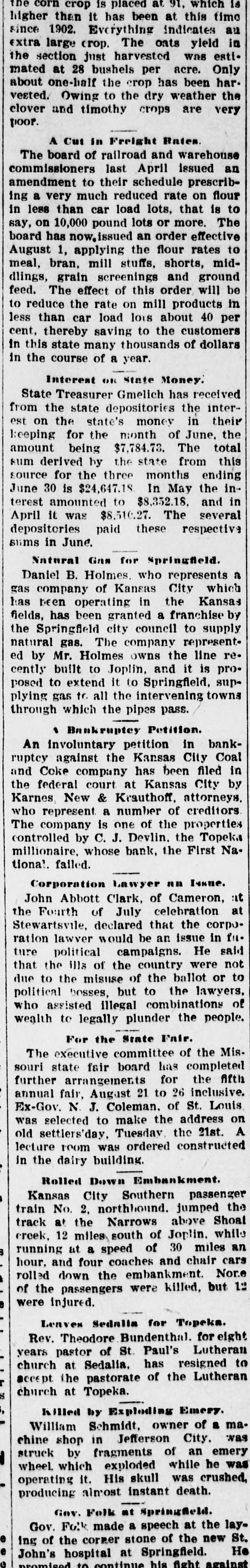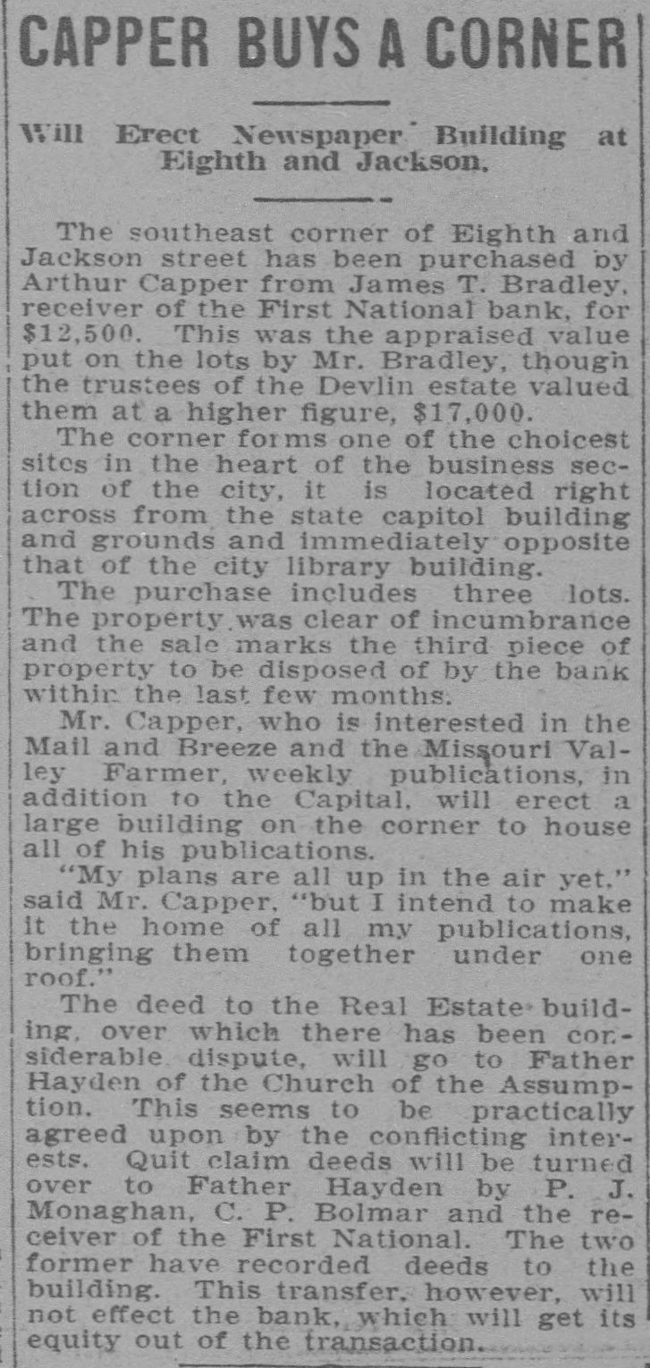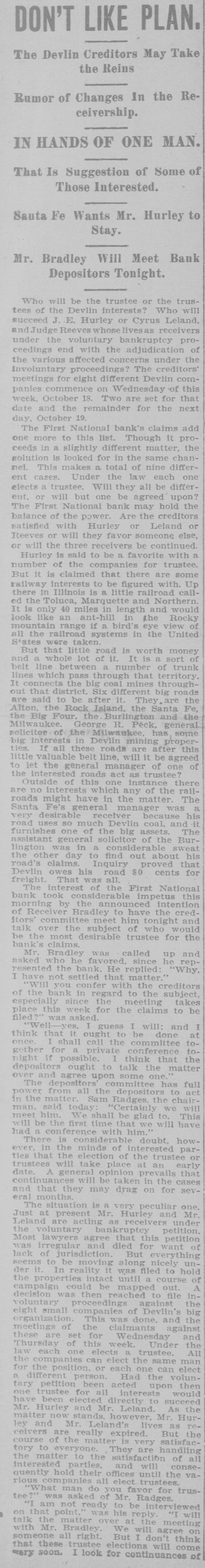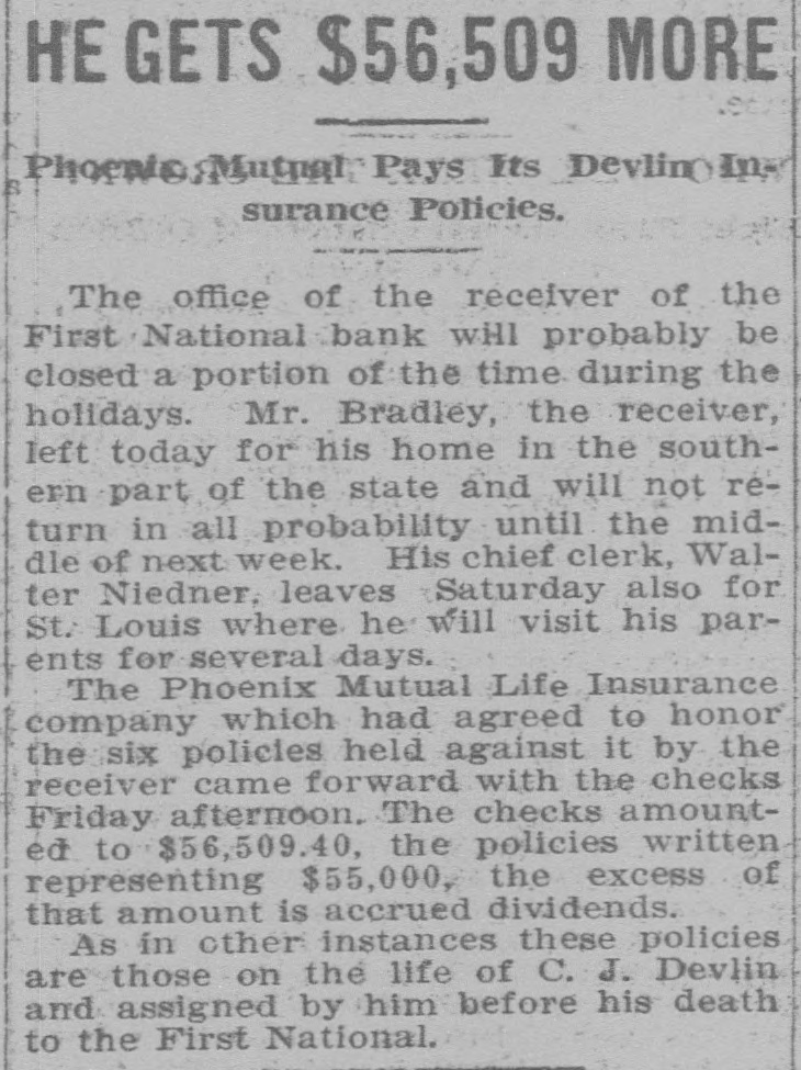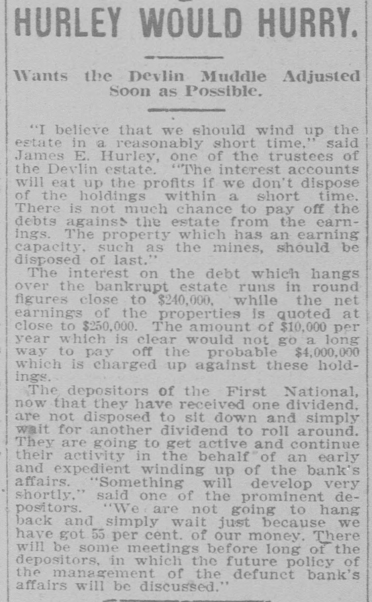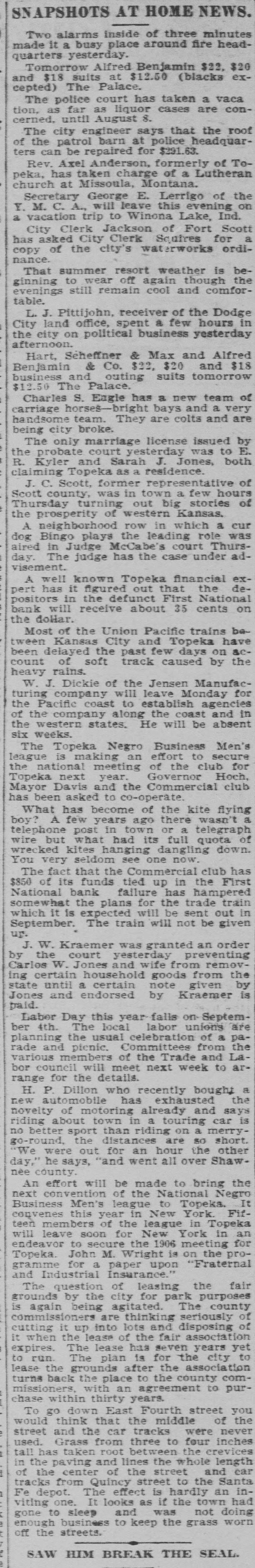 Depositors Waited in Vain for Doors to Open. Notice Posted at Five Minutes Before Nine. SIGNED BY ROSSINGTON Comptroller of the Currency Has Been Notified. C.J. Devlin Turns Topeka Property Over to Bank. WHY THEY GAVE UP. Could Not Raise Enough Money to Meet Demands. Claimed Depositors Will Be Paid in Full. National Examiner Bradley Is Appointed Receiver. At five minutes before 9 o'clock this morning, the following typewritten notice was posted on the front door of the First National bank: "This bank is closed by my order. The comptroller of the currency has been communicated with, and will send examiner who will make a statement. W. H. ROSSINGTON, ice President." "Topeka, Kan.. July 3, 1903." Washington, July 3.-The comptroller of the currency has appointed National Bank Examiner J. T. Bradley receiver of the First National bank. Topeka, Kas., upon receipt of advices from the vice president of the bank that its doors had been closed. A crowd of three or four hundred people, many of whom were depositors, read this notice and quietly dispersed. There was no great amount of excitement. As early as 8 o'clock this morning, it was evident that the First National was in for a run. People began to line up in front of the building, and three or four policemen were detailed to keep the crowd in order. Through the front windows the crowd could see the bank employes and some of the officials walk. ing about in the rear room. There was no evidence of any intention to open the doors. There were no books on the desks, no money in sight and no bustle of preparation to pay off the depositors. Hence the rumor was prevalent through the crowd that the bank would not open for business, and no particular surprise was expressed when the notice was actually posted. About one-third of the crowd at the First National bank was composed of women. The women took the situation with as much composure as did the men, however, and there was no weeping when the notice went up. While the crowd was collecting in front of the First National a smaller crowd assembled on the steps of the Central National. The Central National opened promptly for business. and the rush of depositors was quickly paid off. The people at the Central National who withdrew their money seemed to be mostly savings depositors. There was also considerable of a flurry at the Bank of Topeka. At the Merchants' National bank there were but few people doing any business. At the State Savings there was a small gathering. The North Topeka banks were not affected. The fact that the Monday morning business is usually heavier than other mornings of week served to scare a few timid depositors into the idea that a run was in progress. Depositors May Be Paid. It is claimed, however, at this time that the bank is fully solvent and that the creditors will be paid in full. The closing of the bank hinged upon the inability of the Topeka banks to extend enough aid in addition to the refusal of the banks in Kansas City, Missouri, to come to the rescue of the First National. The Central National bank and the Bank of Topeka both stood ready to help but on condition that the Kansas City banks should extend aid. A wire was received by the First National bank from Kansas City stating their inability to come to the rescue. The answer was terse and no particular interpretation of the refusal could be construed. At eight o'clock the crowds commenced to loiter around in the vicinity of the First National and across the street from vantage points where operations could be viewed In the crowds were curiosity seekers as well as interested depositors. At 8:15 there were some 15 patrons of the bank waiting for the doors to open and at nine o'clock this number had been increased to fully 175. They hung around and pressed forward to the doors until at nine o'clock the statement made by W H. Rossington, director and vice president of the bank. was affixed to the door. Anxious faces pressed close up to the glass dcors to read the statement and then turned away. The press continued The and at 9:30 gradually grew less. people took the statement philosophically and with as much optimism as could be expected. Few words indicative of chagrin or grief were made and the remarks were simply passing in their nature. The groups was divided among the large and small patrons alike. The face of the large as well as the small depositor was seen in the press. One man had $15,000 and but few feet away was small bootblack with savings of a few dollars. Could Not Save Bank. The holding corporation which was to take over the properties of Mr. Devlin will be permitted to lapse. The corporation which was to be established primarily to save the First National bank will be suffered to lapse unless it is found on further examination that it is best to establish such an organization. Mr. J. W. Gleed, who