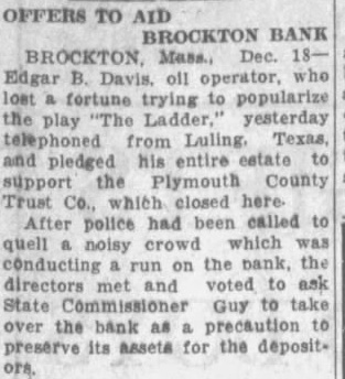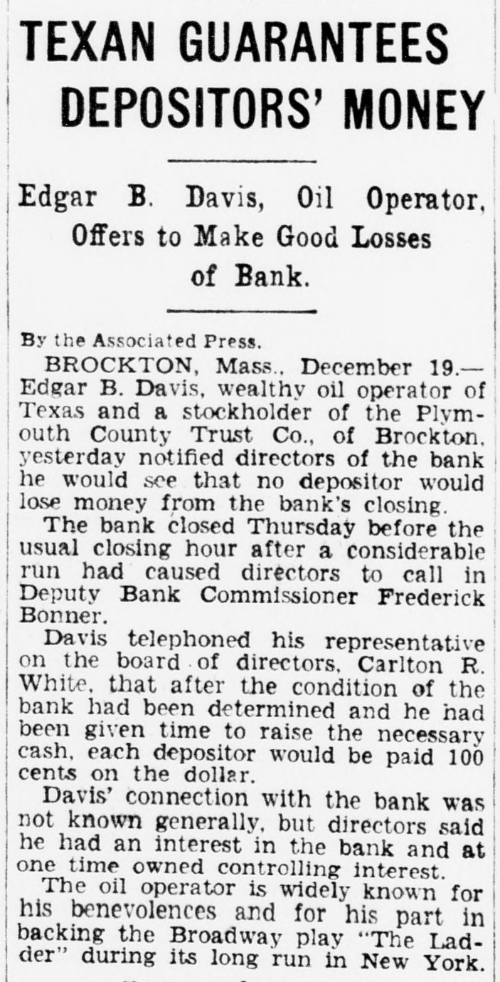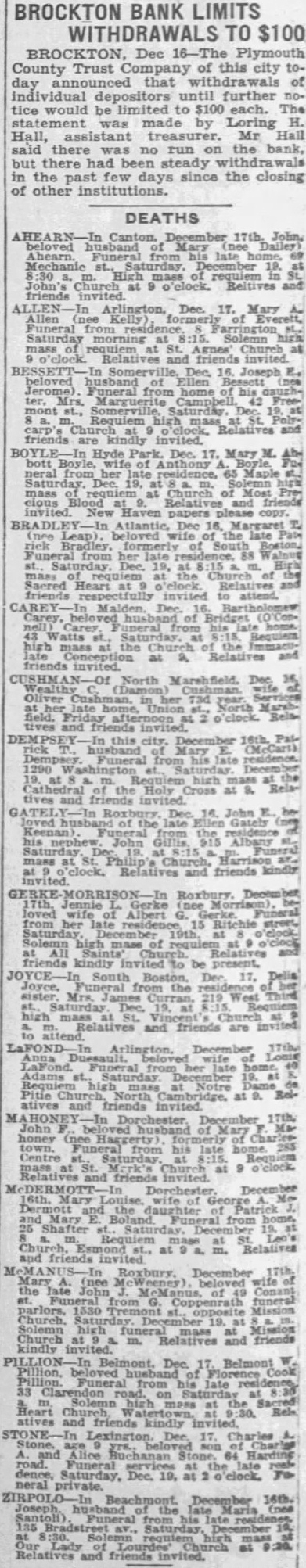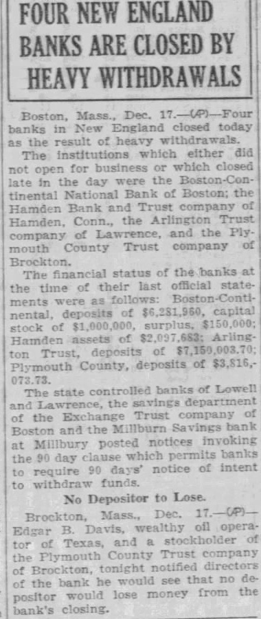 (RC BANCOS CERRAGON SUSPUERTAS sto dic. 19.-Como resulBdo de las grandes vetiradas de dinero, cuatro bancos cerraron a sus puertas ayer, en New Inde gland. de Las instituciones bancarias que han suspendido sus operacio freció nes son el Boston Continental un National, de Boston; el Hamden Bank and Trust Company de Hamden, Conn.; el Arlington Trust Co., de Lawrence, y el Plymouth County Trust Co., de PERBrockton. El estado financiero de los bancos, según los últimos informes rendidos es como sigue: Boston resiContinental, depósitos de 6,281, esqui960 pesos, capital en existencia los de $1,000,000, sobrantes $150, 000; Hamden, valores de 2,097, diez 683 pesos; Arlington Trust, deen pósitos de $7,150,003.70; Plyla a mouth County, depósitos de co- $3,816,073.73.