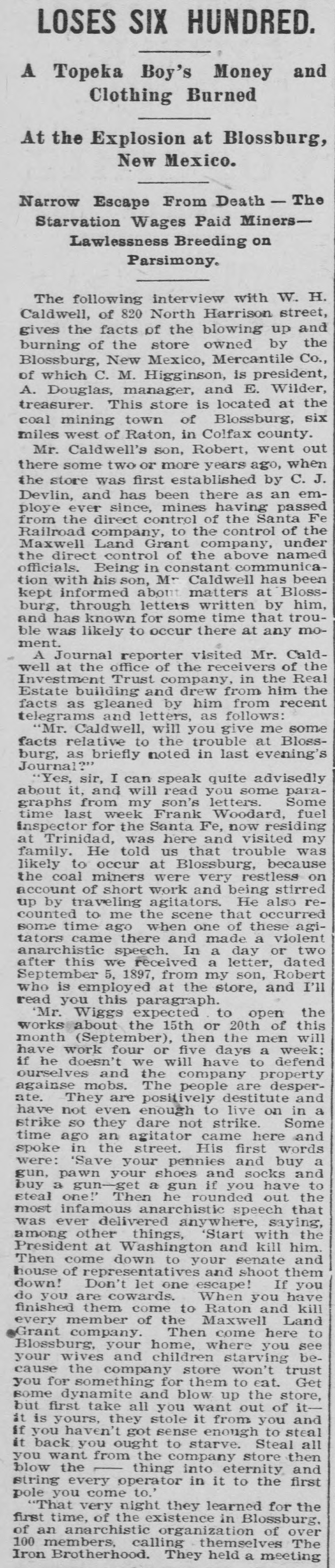 # LOSES SIX HUNDRED. A Topeka Boy's Money and Clothing Burned At the Explosion at Blossburg, New Mexico. Narrow Escape From Death - The Starvation Wages Paid Miners- Lawlessness Breeding on Parsimony. The following interview with W. H. Caldwell, of 820 North Harrison street, gives the facts of the blowing up and burning of the store owned by the Blossburg, New Mexico, Mercantile Co., of which C. M. Higginson, is president, A. Douglas, manager, and E. Wilder, treasurer. This store is located at the coal mining town of Blossburg, six miles west of Raton, in Colfax county. Mr. Caldwell's son, Robert, went out there some two or more years ago, when the store was first established by C. J. Devlin, and has been there as an em- ploye ever since, mines having passed from the direct control of the Santa Fe Railroad company, to the control of the Maxwell Land Grant company, under the direct control of the above named officials. Being in constant communica- tion with his son, Mr Caldwell has been kept informed about matters at Bloss- burg, through letters written by him, and has known for some time that trou- ble was likely to occur there at any mo- ment. A Journal reporter visited Mr. Cald- well at the office of the receivers of the Investment Trust company, in the Real Estate building and drew from him the facts as gleaned by him from recent telegrams and letters, as follows: "Mr. Caldwell, will you give me some facts relative to the trouble at Bloss- burg, as briefly noted in last evening's Journal?" "Yes, sir, I can speak quite advisedly about it, and will read you some para- graphs from my son's letters. Some time last week Frank Woodard, fuel inspector for the Santa Fe, now residing at Trinidad, was here and visited my family. He told us that trouble was likely to occur at Blossburg, because the coal miners were very restless on account of short work and being stirred up by traveling agitators. He also re- counted to me the scene that occurred some time ago when one of these agi- tators came there and made a violent anarchistic speech. In a day or two after this we received a letter, dated September 5, 1897, from my son, Robert who is employed at the store, and I'll read you this paragraph. 'Mr. Wiggs expected to open the works about the 15th or 20th of this month (September), then the men will have work four or five days a week: if he doesn't we will have to defend ourselves and the company property againse mobs. The people are desper- ate. They are positively destitute and have not even enough to live on in a strike so they dare not strike. Some time ago an agitator came here and spoke in the street. His first words were: 'Save your pennies and buy a gun, pawn your shoes and socks and buy a gun-get a gun if you have to steal one!' Then he rounded out the most infamous anarchistic speech that was ever delivered anywhere, saying, among other things, 'Start with the President at Washington and kill him. Then come down to your senate and house of representatives and shoot them down! Don't let one escape! If you do you are cowards. When you have finished them come to Raton and kill every member of the Maxwell Land Grant company. Then come here to Blossburg, your home, where you see your wives and children starving be- cause the company store won't trust you for something for them to eat. Get some dynamite and blow up the store, but first take all you want out of it- it is yours, they stole it from you and if you haven't got sense enough to steal it back you ought to starve. Steal all you want from the company store then blow the thing into eternity and string every operator in it to the first pole you come to.' "That very night they learned for the first time, of the existence in Blossburg, of an anarchistic organization of over 100 members, calling themselves The Iron Brotherhood. They held a meeting