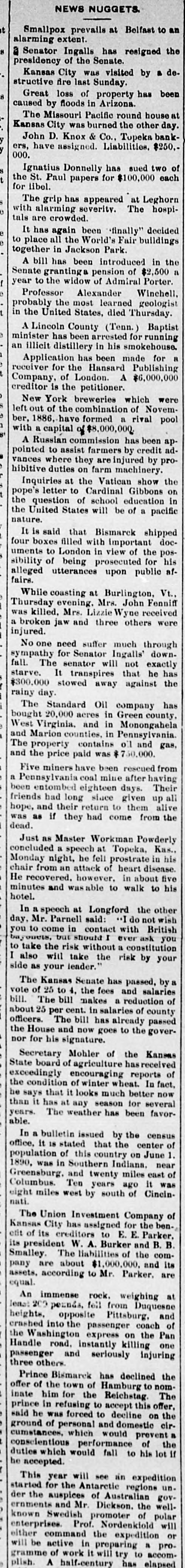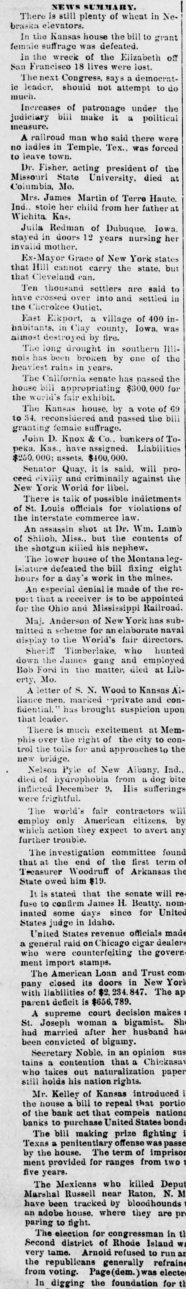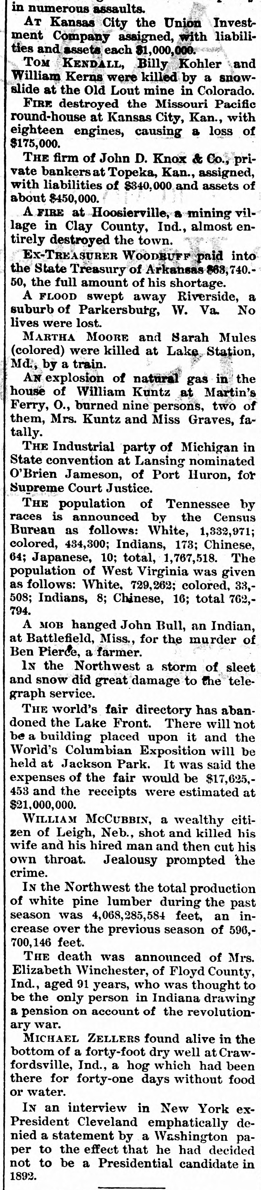in numerous assaults. AT Kansas City the Union Investment Company assigned, with liabilities and assets each $1,000,000. ToM KENDALL, Billy Kohler and William Kerns were killed by a snowslide at the Old Lout mine in Colorado. FIRE destroyed the Missouri Pacific round-house at Kansas City, Kan., with eighteen engines, causing a loss of $175,000. THE firm of John D. Knox & Co., private bankers at Topeka, Kan., assigned, with liabilities of $340,000 and assets of about $450,000. A FIRE at Hoosierville, a mining village in Clay County, Ind., almost entirely destroyed the town. EX-TREASURER WOODBUFF paid into the State Treasury of Arkansas $63,740.50, the full amount of his shortage. A FLOOD swept away Riverside, a suburb of Parkersburg, W. Va. No lives were lost. MARTHA MOORE and Sarah Mules (colored) were killed at Lake Station, Md., by a train. AN explosion of natural gas in the house of William Kuntz at Martin's Ferry, O., burned nine persons, two of them, Mrs. Kuntz and Miss Graves, fatally. THE Industrial party of Michigan in State convention at Lansing nominated O'Brien Jameson, of Port Huron, for Supreme Court Justice. THE population of Tennessee by races is announced by the Census Bureau as follows: White, 1,332,971; colored, 434,300; Indians, 173; Chinese, 64; Japanese, 10; total, 1,767,518. The population of West Virginia was given as follows: White, 729,262; colored, 33,508; Indians, 8; Chinese, 16; total 762,794. A MOB hanged John Bull, an Indian, at Battlefield, Miss., for the murder of Ben Pierce, a farmer. IN the Northwest a storm of sleet and snow did great damage to the telegraph service. THE world's fair directory has abandoned the Lake Front. There will not be a building placed upon it and the World's Columbian Exposition will be held at Jackson Park. It was said the expenses of the fair would be $17,625,453 and the receipts were estimated at $21,000,000. WILLIAM McCUBBIN, a wealthy citizen of Leigh, Neb., shot and killed his wife and his hired man and then cut his own throat. Jealousy prompted the crime. IN the Northwest the total production of white pine lumber during the past season was 4,068,285,584 feet, an increase over the previous season of 596,700,146 feet. THE death was announced of Mrs. Elizabeth Winchester, of Floyd County, Ind., aged 91 years, who was thought to be the only person in Indiana drawing a pension on account of the revolutionary war. MICHAEL ZELLERS found alive in the bottom of a forty-foot dry well at Crawfordsville, Ind., a hog which had been there for forty-one days without food or water. IN an interview in New York exPresident Cleveland emphatically denied a statement by a Washington paper to the effect that he had decided not to be a Presidential candidate in 1892.