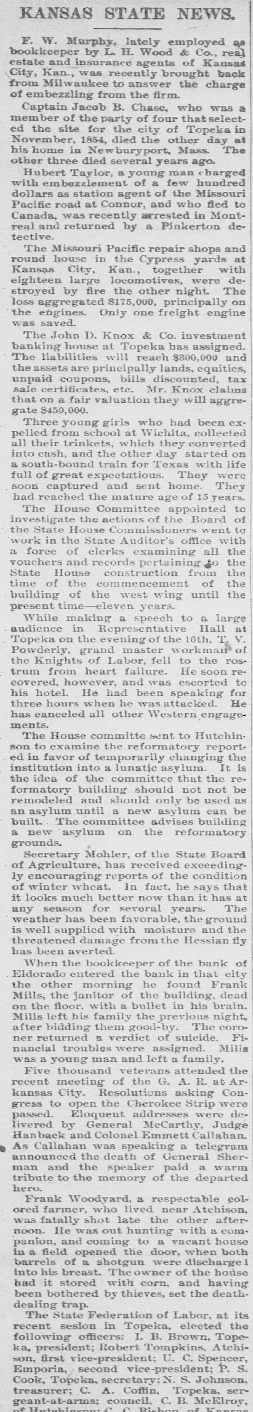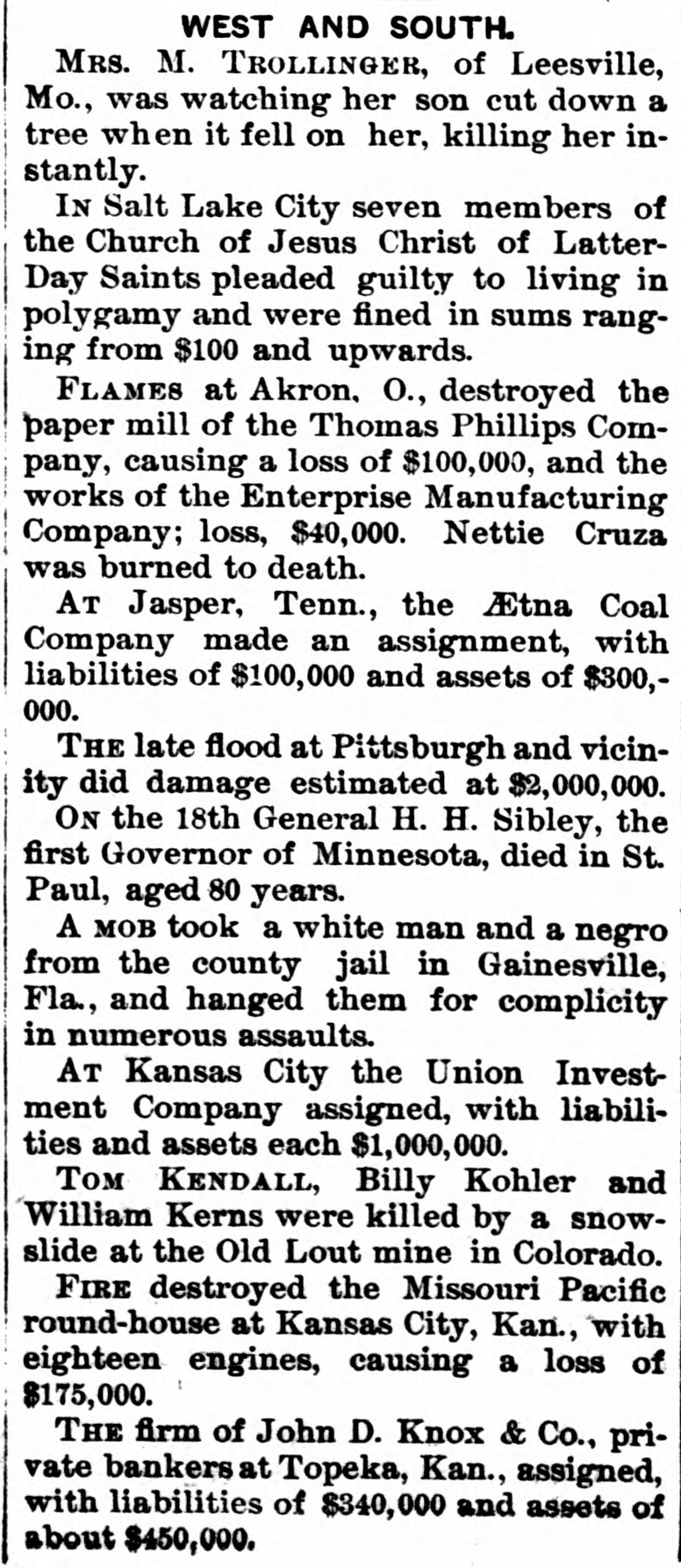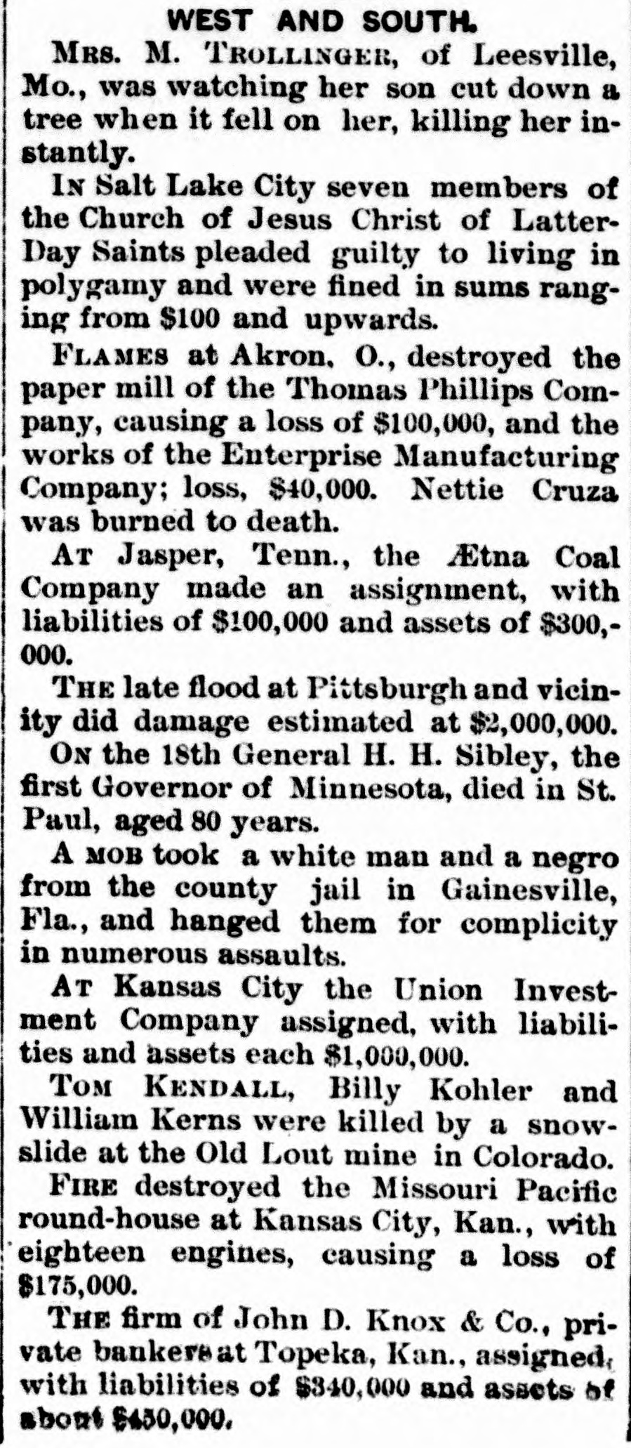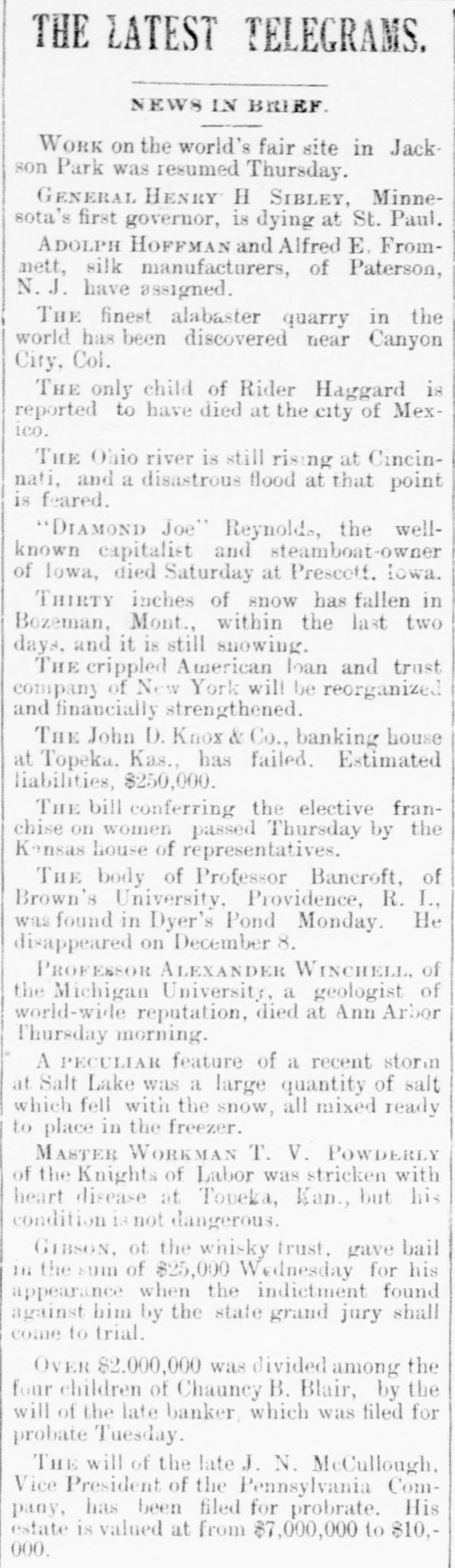in numerous assaults. AT Kansas City the Union Investment Company assigned, with liabilities and assets each $1,000,000. ToM KENDALL, Billy Kohler and William Kerns were killed by a snowslide at the Old Lout mine in Colorado. FIRE destroyed the Missouri Pacific round-house at Kansas City, Kan., with eighteen engines, causing a loss of $175,000. THE firm of John D. Knox & Co., private bankers at Topeka, Kan., assigned, with liabilities of $340,000 and assets of about $450,000. A FIRE at Hoosierville, a mining village in Clay County, Ind., almost entirely destroyed the town. EX-TREASURER WOODBUFF paid into the State Treasury of Arkansas $63,740.50, the full amount of his shortage. A FLOOD swept away Riverside, a suburb of Parkersburg, W. Va. No lives were lost. MARTHA MOORE and Sarah Mules (colored) were killed at Lake Station, Md., by a train. AN explosion of natural gas in the house of William Kuntz at Martin's Ferry, O., burned nine persons, two of them, Mrs. Kuntz and Miss Graves, fatally. THE Industrial party of Michigan in State convention at Lansing nominated O'Brien Jameson, of Port Huron, for Supreme Court Justice. THE population of Tennessee by races is announced by the Census Bureau as follows: White, 1,332,971; colored, 434,300; Indians, 173; Chinese, 64; Japanese, 10; total, 1,767,518. The population of West Virginia was given as follows: White, 729,262; colored, 33,508; Indians, 8; Chinese, 16; total 762,794. A MOB hanged John Bull, an Indian, at Battlefield, Miss., for the murder of Ben Pierce, a farmer. IN the Northwest a storm of sleet and snow did great damage to the telegraph service. THE world's fair directory has abandoned the Lake Front. There will not be a building placed upon it and the World's Columbian Exposition will be held at Jackson Park. It was said the expenses of the fair would be $17,625,453 and the receipts were estimated at $21,000,000. WILLIAM McCUBBIN, a wealthy citizen of Leigh, Neb., shot and killed his wife and his hired man and then cut his own throat. Jealousy prompted the crime. IN the Northwest the total production of white pine lumber during the past season was 4,068,285,584 feet, an increase over the previous season of 596,700,146 feet. THE death was announced of Mrs. Elizabeth Winchester, of Floyd County, Ind., aged 91 years, who was thought to be the only person in Indiana drawing a pension on account of the revolutionary war. MICHAEL ZELLERS found alive in the bottom of a forty-foot dry well at Crawfordsville, Ind., a hog which had been there for forty-one days without food or water. IN an interview in New York exPresident Cleveland emphatically denied a statement by a Washington paper to the effect that he had decided not to be a Presidential candidate in 1892.