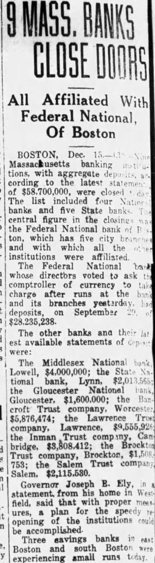 CLOSE All Affiliated With Federal National, Of Boston BOSTON, Dec. banking tions, with aggregate cording the latest were The list included four banks and five State central figure the closing the Federal National bank which has five city with which the institutions were affiliated. The Federal National whose directors voted to comptroller currency to charge after runs the and its branches deposits, September The other banks and available statements of The Middlesex National Lowell, $4,000,000; the State tional bank, Lynn, the Gloucester National $1,600,000; the croft Trust company, $5,876,474; the company, the Inman Trust bridge, $3,808,412; the Trust company, Brockton, 753; the Salem Trust $2,115,530. Governor Joseph B. Ely, his home field, said that with proper plan for the ures, the institutions opening Three savings banks Boston south Boston experiencing small runs today.