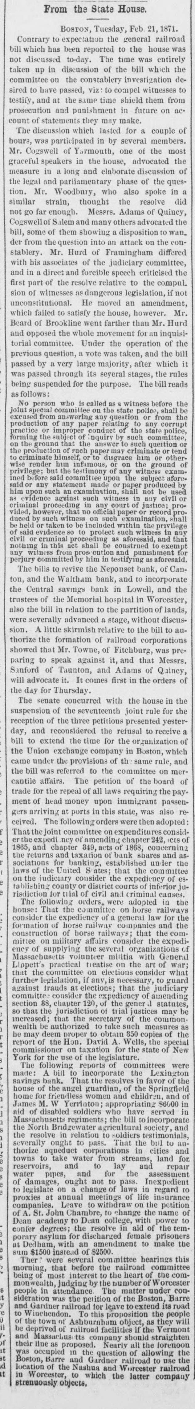 From the State House. BOSTON, Tuesday, Feb 21, 1871. Contrary to expectation the general railroad bill which has been reported to the house was not discussed to-day. The time was entirely taken up in discussion of the bill which the committee on the constablery investigation desired to have passed, viz: to compel witnesses to testify, and at the same time shield them from prosecution and punishment in future on account of statements they may make. The discussion which lasted for a couple of hours, was participated in by several members. Mr. Cogswell of Yarmouth, one of the most graceful speakers in the house, advocated the measure in a long and elaborate discussion of the legal and parliamentary phase of the question. Mr. Woodbury, who also spoke in a similar strain, thought the resolve did not go far enough. Messrs. Adams of Quincy, Cogswell of Salem and many others advocated the bill, some of them showing a disposition to wan. der from the question into an attack on the constablery. Mr. Hurd of Framingham differed with his associates of the judiciary committee, and in a direct and forcible speech criticised the first part of the resolve relative to the compul. sion of witnesses as dangerous legislation, if not unconstitutional. He moved an amendment, which failed to satisfy the house, however. Mr Beard of Brookline went farther than Mr. Hurd and opposed the whole movement for an inquisitorial committee. Under the operation of the previous question, a vote was taken, and the bill passed by a very large majority, after which it was passed through its several stages, the rules being suspended for the purpose. The bill reads as follows: No person who is called as 8 witness before the joint special committee on the state police, shall excused from answering any question or from the production of any paper relating to any corrupt practice or improper conduct of the state police, forming the subject of nquiry by such committee, on the ground that the answer to such queition o the production of such paper may criminate or tend to criminate himself or disgrace him or otherwise render him infamous, or on the ground of privilege; but the testimony of any witness examined before said committee upon the subject afore. said or any statement made or paper produced by him upon such an examination, shall not be used evidence aguinst such witness any civil or criminal proceeding in any court of justice; provided, however, that no official paper or record produced by such witness on such exam mination, shall be held or taken to be included within the privilege of said evidence so to protect such witness in any civil or criminal proceeding as aforesaid, and that nothing in this act shall be construed to exempt any witness from prose cution and punishment for perjury comm mitted by him in testifying as aforesaid The bills to revive the Neponset bank, of Canton, and the Waltham bank, and to incorporate the Central savings bank in Lowell, and the trustees of the Memorial hospital in Worcester, also the bill in relation to the partition of lands, were severally advanced a stage, without discussion. A little skirmish relative to the bill to authorize the formation of railroad corporations showed that Mr. Towne, of Fitchburg, was preparing to speak against it, and that Messrs. Sanford of Taunton, and Adams of Quincy, will advocate it. It comes first in the orders of the day for Thursday. The senate concurred with the house in the suspension of the seventeenth joint rule for the reception of the three petitions presented yesterday, and reconsidered the refusal to receive a bill to extend the time for the organization of the Union exchange company in Boston, which came under the provisions of th same rule, and the bill was referred to the committee on mercantile affairs. The petition of the board of trade for the repeal of all laws requiring the payment of head money upon immigrant passengers arriving at ports in this state, was also received. The following orders were then adopted That the joint committee on expenditures consider the expedi ncy of amending chapter 242, ets 1865, and chapter 849, acts of 1868, concerning the returns and taxation of bank shares and associations for banking, established under laws of the United ates; that the committee on the judiciary consider the expediency of establishing county or district courts of inferior jurisdiction for trial of civil and criminal causes. The following orders. were adopted in the house: That the committee on horse railways consider the expediency of general law for the formation of horse railway companies and the construction of horse railways; that the committee on military affairs consider the expediency of supplying the several organizations Massachusetts volunteer militia with General Lippett's practical treatise on the art of war; that the committee on elections consider what further legislation, if any, is necessary, to guard against frauds at elections; that the judiciary committee consider the expediency of amending section 88, chapter 120, of the gener a statutes, so that the jurisdiction of trial justices may be increased; that the secretary of the common wealth be authorized to take such measures as be may deem proper to obtain 850 copies of the report of the Hon. David A. Wells, the special commissioner on taxation for the state of New York for the use of the legislature. The following reports of committees were made: A bill to incorporate the Lexington savings bank. That the resolves in favor of the house of the angel guardian, of the Springfield home for friendless women and children, and James M. W Yerriaton; appropriating $6000 aid of disabled soldiers who have served Massachusetts regiments; the bill to incorporate the North Bridgewater agricultural society and the resolve in relation to soldiers testimonials, severally ought to pass. That the bill to anthorize aqueduct corporations in cities and towns to take water from streams, land for 