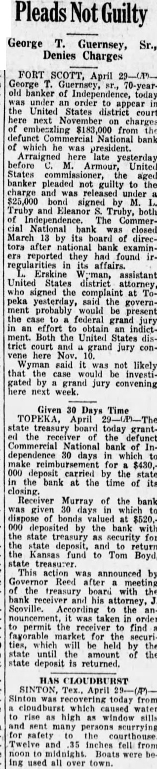 George Guernsey, Sr., Denies Charges FORT SCOTT, April George Guernsey, banker of Independence, today under an order appear United States district court next November charges $183,000 from National bank which he president. Arraigned here yesterday Armour, United States banker pleaded not guilty charge and $25,000 signed Truby Eleanor Truby, both The National bank closed March its board directors after national bank examinreported they had found iraffairs. Erskine assistant United States district attorney, signed the peka yesterday, said the government probably would be present the case federal grand effort obtain indictment. Both the United States district court and grand jury conhere Nov. Wyman not likely that the case investigated by grand jury convening here next week. Given 30 Days Time TOPEKA, April state treasury board today the the defunct National bank of days which for $430,000 deposit carried the bank at the time of its closing. Receiver Murray of bank given which dispose bonds valued $520,deposited the bank state treasury security the deposit, return Kansas fund to Tom Boyd, treasurer This action announced Governor Reed after meeting the treasury board with bank his attorney, Scoville. According the anpermit the find fayorable market for the securiheld the state until the amount the state deposit returned. SINTON, April Sinton today from cloudburst which caused rise high window and sent many persons scurrying for safety courthouse. Twelve inches fell noon midnight. Boats were used all over town.