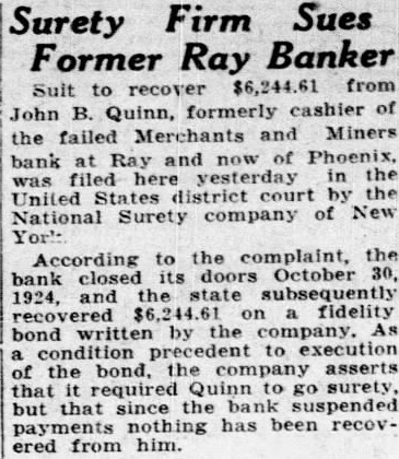 Surety Firm Sues Former Ray Banker Sult to recover from John B. Quinn, formerly cashier of the failed Merchants and Miners bank at Ray and now of Phoenix, was filed yesterday in the United States district court by the National Surety company of New According to the complaint, the bank closed its doors October 30, 1924, and the state subsequently recovered $6,244.61 on a fidelity bond written by the company. As