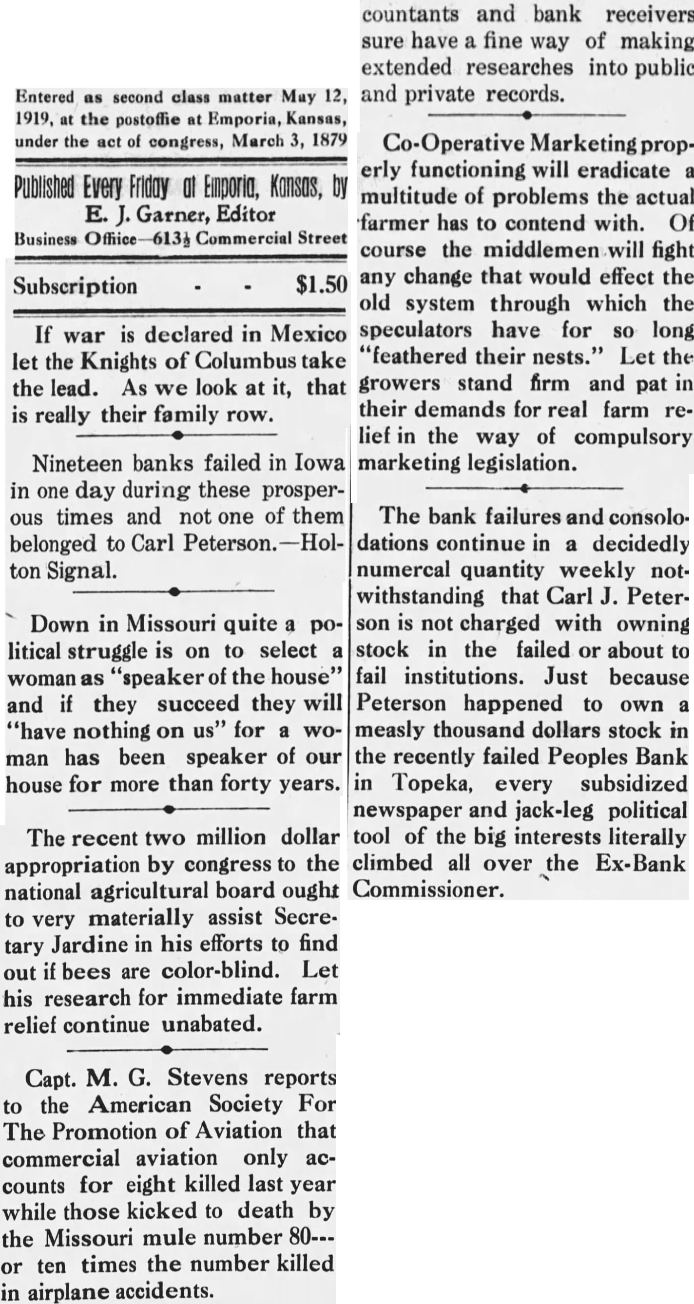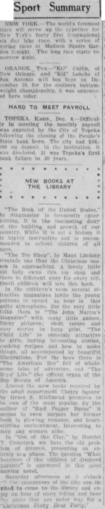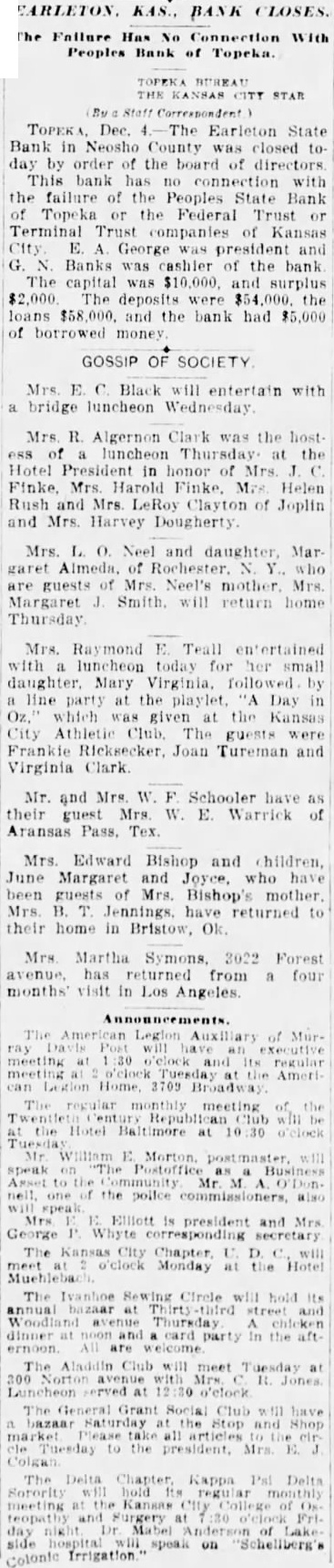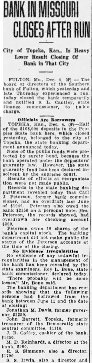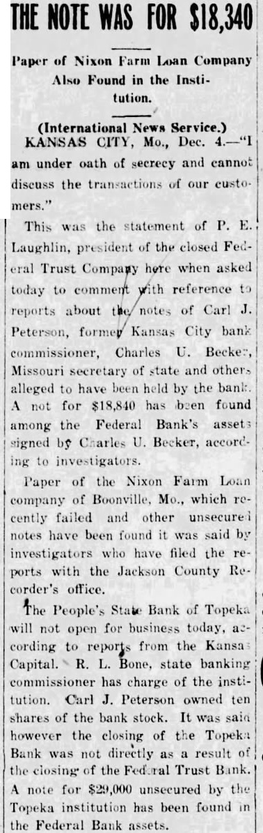 $18,340 Paper of Nixon Farm Loan Company Also Found in the Institution. (International News KANSAS CITY, Mo., Dec. under oath of secrecy and cannot discuss the transactions of our This was the statement of Laughlin, president of the closed Trust Company here when asked today to comment reference reports about of Carl Peterson, Kansas City bank commissioner, Charles U. Becker, Missouri secretary of state and others alleged to have been held by the bank for $18,840 has been found the Federal Bank's assets among signed by Charles U. Becker, according investigators. Paper of the Nixon Farm Loan company of Boonville, Mo., which cently failed and other unsecured notes have been found was said by investigators who have filed the ports with the Jackson County corder's office. People's State Bank of Topeka will not open for business today, cording to reports from the Kansa Capital. Bone, state banking commissioner has charge of the institution. Carl Peterson owned ten shares of the bank stock. It was said however the closing of the Topeka Bank was not directly as result the closing of the Federal Trust Bank. note for $29,000 unsecured by the Topeka institution has been found the Federal Bank assets.