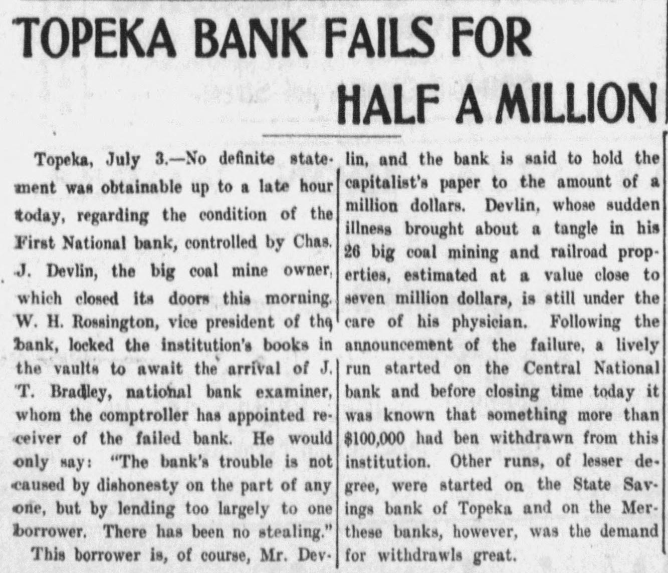 TOPEKA BANK SHUTS DOOR LARGE LOANS TO ONE MAN. C. J. Devlin, One of the Wealthiest Men in Kansas City, Involved. Topeka, Kan., July 3.-The First National Bank of Topeka, of which C. J. Devlin is the principal stockholder, failed to open its doors to-day. The government officials are making an examination of the bank's affairs, but gave out no statement to-day. On the door of the bank appeared this notice: This bank is closed by orders. The Controller of the Currency has been communicated with and will send an examiner, who will make a statement. W. H. ROSSINGTON, Vice-President. No definite statement was obtainable to-day regarding the condition of the First National Bank, controlled by Charles J. Devlin, a wealthy coal mine owner, which closed its doors this morning. Colonel W. H. Rossington, vice-president of the bank. locked the institution's books in the vault to await the arrival of J. T. Bradley, national bank examiner, whom the Controller had appointed receiver of the failed bank. Colonel Rossington would only say: "The bank's trouble has not been caused by dishonesty on the part of any one, but by lending too largely to one borrower. There has been no stealing." The borrower, it is said, is Mr. Devlin, and the bank is said to hold the capitalist's paper to the amount of $1,000,000. Mr. Devlin, whose sudden illness brought about the tangle in the big coal minrailroad valued, at close to $7,000,000. is still under care ing and properties, it the is estimated, from of a physician, and no statement can be obtained him. All that came from his home to-day was that coal had over in life insurance the bank stricken nearly $700,000 operator turned and about to the the same amount in Topeka real estate. Business associates of Mr. Devlin expressed their opinion that if properly handled this would allow the bank to pay out. Aside from the temporary flurry that the failure of the First National Bank caused on the other banks of the city, the most interesting phase of the situation was the statement of the State Treasurer, T. T. Kelly, that the bank held $547,000 of the State's funds. Mr. Devlin was one of the Mr. Kelly's bondsmen. Following the announcement of the failure, a lively but not disastrous run was started on the Central National Bank. Other runs of a lesser degree were started on the State Savings Bank, the Bank of Topeka and on the Merchants' National Bank. At none of these banks, however, was the demand for withdrawals great. Following the closing of the First National Bank there was a slight run on the Central National Bank, in which Mr. Devlin also is a large stockholder, and there were small runs later in the day on the Merchants' National Bank, the Bank of Topeka and the State Savings Bank. At each of these institutions all depositors who requested their money were paid and confidence was expressed in the ability to meet any demands of the depositors. Cash to the amount of $300,000 was deposited in the Central National to offset the run. J. W. Gleed stated that $700,000 worth of real estate -$300,000 unencumbered Topeka property, the other $400,000 in coal lands in Southeastern Kansas-had been turned in by Mr. Devlin, together with $700,000 life insurance. Mr. Gleed asserted that the Central National was in a perfectly solvent condition. He further stated that nothing more would be done with the Missouri organization of the Devlin property until after the report of the Controller here. In the First National Bank the State of Kansas has over $500,000 in deposits, the city of Topeka. $39,000, and the county of Shawnee about $30,000. Mr. Devlin, who has been under the care of a physician, was unable to leave his home to-day. He was up and around, however. He was in the best of spirits, and in reply to questions, said that he expected to be able to go to the bank in another week.