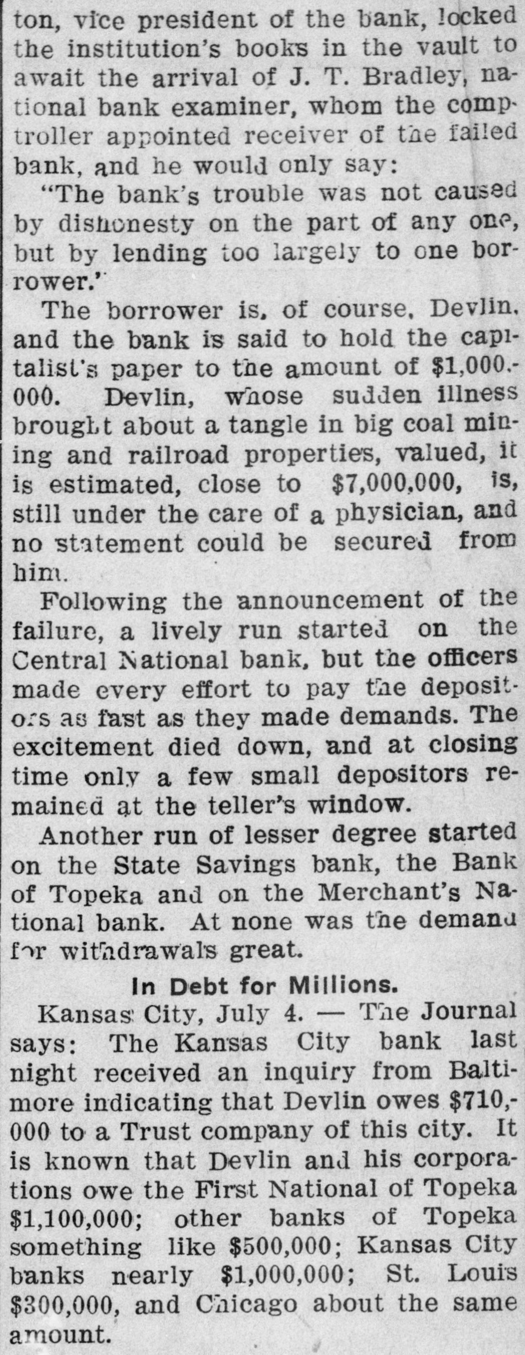 ton, vice president of the bank, locked the institution's books in the vault to await the arrival of J. T. Bradley, national bank examiner, whom the comptroller appointed receiver of the failed bank, and he would only say: "The bank's trouble was not caused by dishonesty on the part of any one, but by lending too largely to one borrower." The borrower is, of course, Devlin. and the bank is said to hold the capitalist's paper to the amount of $1,000.000. Devlin, whose sudden illness brought about a tangle in big coal mining and railroad properties, valued, it is estimated, close to $7,000,000, is, still under the care of a physician, and no statement could be secured from him. Following the announcement of the failure, a lively run started on the Central National bank, but the officers made every effort to pay the depositors as fast as they made demands. The excitement died down, and at closing time only a few small depositors remained at the teller's window. Another run of lesser degree started on the State Savings bank, the Bank of Topeka and on the Merchant's National bank. At none was the demanu for withdrawals great. In Debt for Millions. Kansas City, July 4. - The Journal says: The Kansas City bank last night received an inquiry from Baltimore indicating that Devlin owes $710,000 to a Trust company of this city. It is known that Devlin and his corporations owe the First National of Topeka $1,100,000; other banks of Topeka something like $500,000; Kansas City banks nearly $1,000,000; St. Louis $300,000, and Chicago about the same amount.