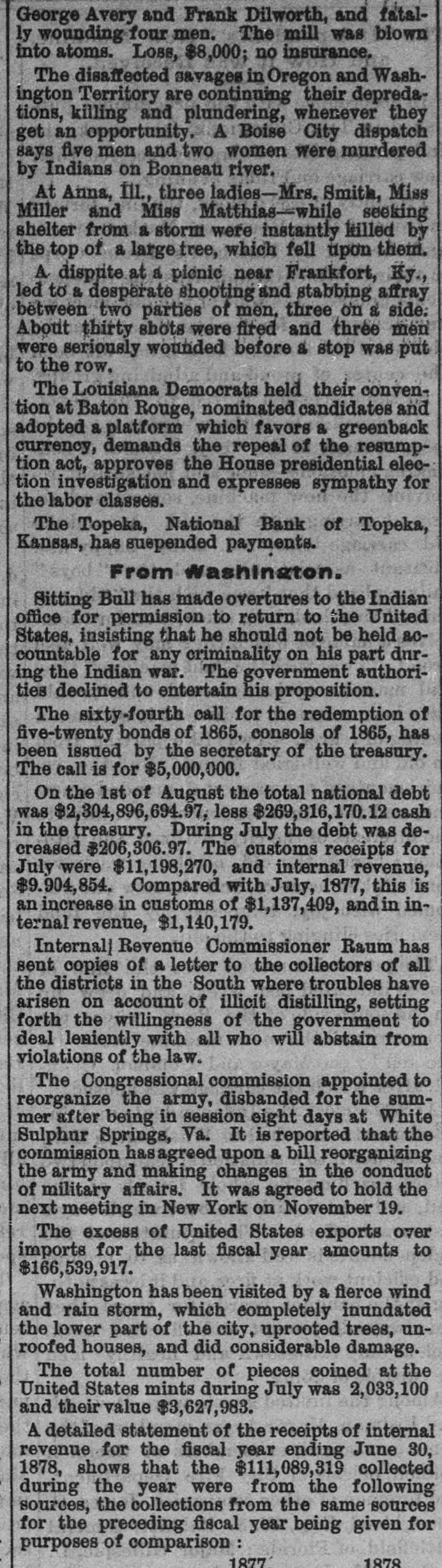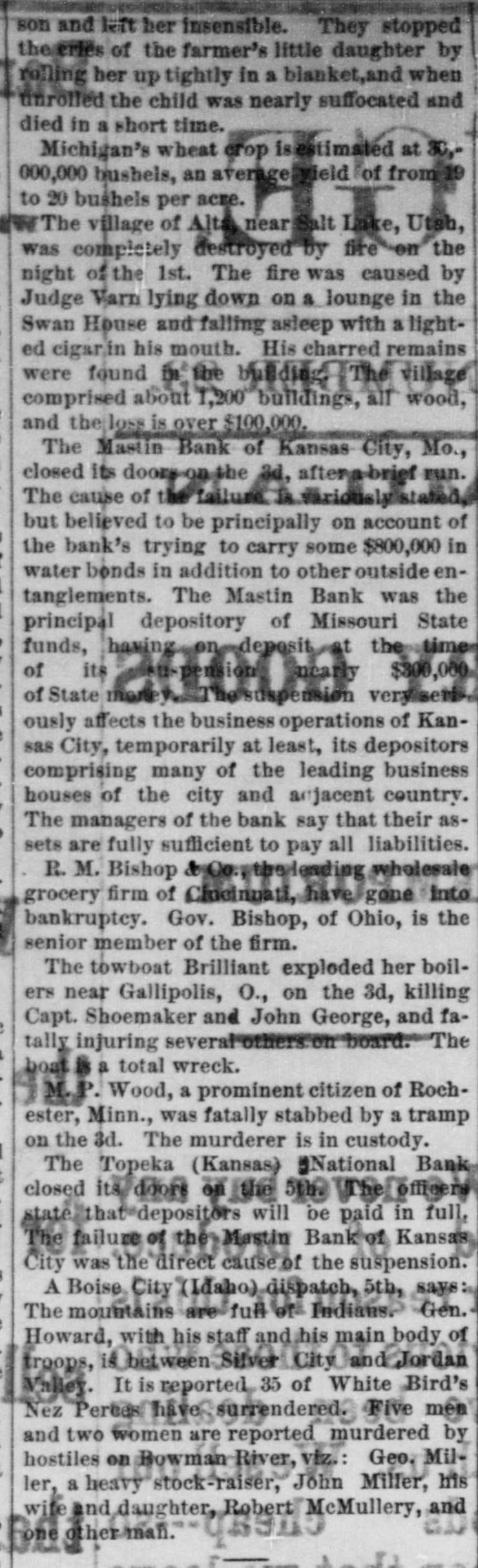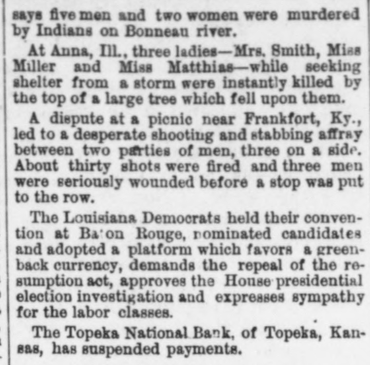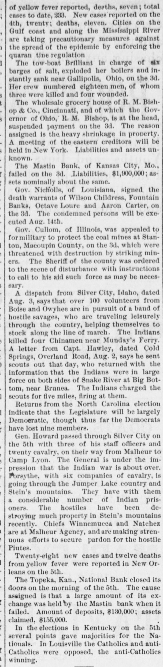 TELEGRAPHIC NEWS. NOON DISPATCHES DOMESTIC. Kearney's Communism. BOSTON, August 6 -The following resolutions were adopted at the Kearney meeting last night WHEREAS, This republic, instituted for the avowed purpose of advancing and conserving the interests of the mass, has been reduced to a plutocracy that employs the Republican and Democratic parties in the perfidious work of establishing thieving monopolies and class privileges that sap the blood of national industries 80 that it can be lapped by the vampires of capital. Whereas, All laws enacted that are not in the direct and open interest of the producing and labor classes are crimes against the spirit and prosperity of this republic, for which legislators should be branded with infamy of criminal imprisonment. Whereas, An intamous, if not a criminal class, of legislation has been heaped upon the industries of the nation by political parties until the burden has become & torture of the mass from which there is no escape except by uniting the material interests of the producing and laboring people of all classes in such political action as will give them their rightful control of State and national legislation, a privilege of which they have been plundered, and thereby restore this government to the just and lofty purposes for which it was instituted by our fathers; therefore, Resolved, By the citizens of Boston, in Fanueil Hall assembled, that it is in the highest and truest interest of all industrial classes in New England, that they should extend P. hearty, cordial and united support to Dennis Kearney, the great and efficient apostle of the laboring classes of California, who comes among them for the noble purpose of uniting them as he united their brothers in his own State in that political action which 18 necessary to restore this government to the just and human principles for which it was instituted, so that the prosperity of this people may be recalled and firmly established. Kearney in his harangue last night used much of his vocabulary to vilify the Associated Press; reading from a San Francisco Chronicle dispatch. He attributed it to the Associated Press. No such dispatch was sent from this office. The only dispatch we have sent, besides the simple announcement of his arrival and the programme for the meeting last night, was a report of the interview between Butler and Kearney, furnished by Kearney's private secretary, and afterwards peddled out to Boston morning papers for $5 each by the secretary. Railroad Accident. ELIZABETH, N. J., August 6.-Last night the coal train west bound on the Lebigh Valley Railroad, a mile and a half west of Bound Brook, ran into a section of a train ahead, smashing several coal cars and strewing the wreck across both tracks. The eastward bound train came along under full headway, ran into the wreck and was thrown from the track and the fireman killed and the engineer bruised. PHONIXVILLE, Pa., August 6.-A terrific storm, accompanied by thunder and lightning, passed over this town last night, doing considerable damage. Robert Townsend and Erwin Roberts, of Philadelphia, were overtaken by the storm and took shelter under a tree, which was struck by lightning. Townsend was instantly killed and Roberts is not expected to recover. The Saratoga Races. SARATOGA, August 6.-Extra day of races. First race-for two-year olds; five furlongs, Dellinds won; Monter, second; Dan Sporting, third; time, 1:4 1-2. Second race-handicap sweepstakes; mile and 8 half; Bonnie Wood won; Hattie F., second; Inspiration, third time, 2:40 1-2. Storm in Pennsylvania. CANTON, Penn., August 6.-This village was visited last night by 8 heavy thunder storm. The reservoir belong ing to the Canton Water Company gave way, doing considerable damage. The large sash and blind factory of Coon & Brain was entirely swept away, together with several banks and shops. Many dwelling houses were filled with water, the inmates barely escaping with their lives. Most of the bridges on Towanda creek were swept away. No lives lost. Bank Suspension. TOPEKA, Kan., August 6.-The Topeka National Bank has closed its doors. The president says it was caused by the large amount of exchange held by the Mastin Bank when it failed. It is thought it will pay deposits in full. Failures. CHICAGO, August 6.-James Clements, former partner in firm of Clements, Morton & Co., has filed a petition of bankruptcy. Liabilities, $117,000; assets, $75,000; mostly encumbered lands.