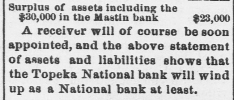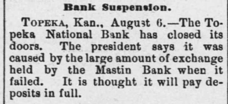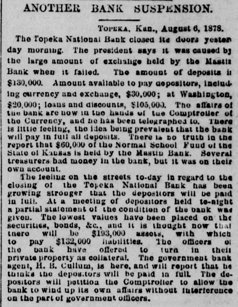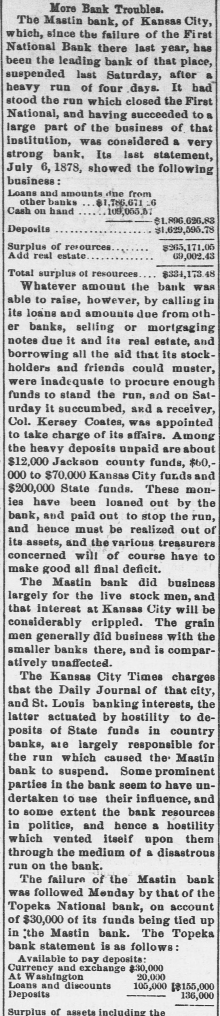 TELEGRAPHIC NEWS. NOON DISPATCHES DOMESTIC. Kearney's Communism. BOSTON, August 6 -The following resolutions were adopted at the Kearney meeting last night WHEREAS, This republic, instituted for the avowed purpose of advancing and conserving the interests of the mass, has been reduced to a plutocracy that employs the Republican and Democratic parties in the perfidious work of establishing thieving monopolies and class privileges that sap the blood of national industries 80 that it can be lapped by the vampires of capital. Whereas, All laws enacted that are not in the direct and open interest of the producing and labor classes are crimes against the spirit and prosperity of this republic, for which legislators should be branded with infamy of criminal imprisonment. Whereas, An intamous, if not a criminal class, of legislation has been heaped upon the industries of the nation by political parties until the burden has become & torture of the mass from which there is no escape except by uniting the material interests of the producing and laboring people of all classes in such political action as will give them their rightful control of State and national legislation, a privilege of which they have been plundered, and thereby restore this government to the just and lofty purposes for which it was instituted by our fathers; therefore, Resolved, By the citizens of Boston, in Fanueil Hall assembled, that it is in the highest and truest interest of all industrial classes in New England, that they should extend P. hearty, cordial and united support to Dennis Kearney, the great and efficient apostle of the laboring classes of California, who comes among them for the noble purpose of uniting them as he united their brothers in his own State in that political action which 18 necessary to restore this government to the just and human principles for which it was instituted, so that the prosperity of this people may be recalled and firmly established. Kearney in his harangue last night used much of his vocabulary to vilify the Associated Press; reading from a San Francisco Chronicle dispatch. He attributed it to the Associated Press. No such dispatch was sent from this office. The only dispatch we have sent, besides the simple announcement of his arrival and the programme for the meeting last night, was a report of the interview between Butler and Kearney, furnished by Kearney's private secretary, and afterwards peddled out to Boston morning papers for $5 each by the secretary. Railroad Accident. ELIZABETH, N. J., August 6.-Last night the coal train west bound on the Lebigh Valley Railroad, a mile and a half west of Bound Brook, ran into a section of a train ahead, smashing several coal cars and strewing the wreck across both tracks. The eastward bound train came along under full headway, ran into the wreck and was thrown from the track and the fireman killed and the engineer bruised. PHONIXVILLE, Pa., August 6.-A terrific storm, accompanied by thunder and lightning, passed over this town last night, doing considerable damage. Robert Townsend and Erwin Roberts, of Philadelphia, were overtaken by the storm and took shelter under a tree, which was struck by lightning. Townsend was instantly killed and Roberts is not expected to recover. The Saratoga Races. SARATOGA, August 6.-Extra day of races. First race-for two-year olds; five furlongs, Dellinds won; Monter, second; Dan Sporting, third; time, 1:4 1-2. Second race-handicap sweepstakes; mile and 8 half; Bonnie Wood won; Hattie F., second; Inspiration, third time, 2:40 1-2. Storm in Pennsylvania. CANTON, Penn., August 6.-This village was visited last night by 8 heavy thunder storm. The reservoir belong ing to the Canton Water Company gave way, doing considerable damage. The large sash and blind factory of Coon & Brain was entirely swept away, together with several banks and shops. Many dwelling houses were filled with water, the inmates barely escaping with their lives. Most of the bridges on Towanda creek were swept away. No lives lost. Bank Suspension. TOPEKA, Kan., August 6.-The Topeka National Bank has closed its doors. The president says it was caused by the large amount of exchange held by the Mastin Bank when it failed. It is thought it will pay deposits in full. Failures. CHICAGO, August 6.-James Clements, former partner in firm of Clements, Morton & Co., has filed a petition of bankruptcy. Liabilities, $117,000; assets, $75,000; mostly encumbered lands.