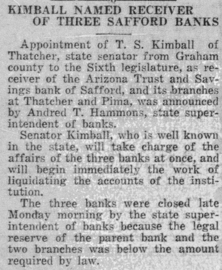 KIMBALL NAMED RECEIVER OF THREE SAFFORD BANKS Appointment of T. S. Kimball of Thatcher, state senator from Graham county to the Sixth legislature, as receiver of the Arizona Trust and Savings bank of Safford, and its branches at Thatcher and Pima, was announced by Andred T. Hammons, state superintendent of banks. Senator Kimball, who is well known in the state, will take charge of the affairs of the three banks at once, and will begin immediately the work of liquidating the accounts of the institution. The three banks were closed late Monday morning by the state superintendent of banks because the legal reserve of the parent bank and the two branches was below the amount required by law.