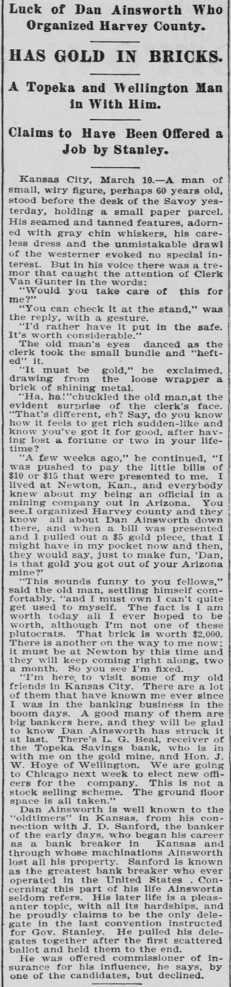 Luck of Dan Ainsworth Who Organized Harvey County. HAS GOLD IN BRICKS. A Topeka and Wellington Man in With Him. Claims to Have Been Offered a Job by Stanley. Kansas City, March 10.-A man of small, wiry figure, perhaps 60 years old, stood before the desk of the Savoy yesterday, holding a small paper parcel. His seamed and tanned features, adorned with gray chin whiskers, his careless dress and the unmistakable drawl of the westerner evoked no special interest. But in his voice there was a tremor that caught the attention of Clerk Van Gunter in the words: "Would you take care of this for me?" "You can check it at the stand," was the reply, with a gesture. "I'd rather have it put in the safe. It's worth considerable." The old man's eyes danced as the clerk took the small bundle and "hefted" it. "It must be gold," he exclaimed. drawing from the loose wrapper a brick of shining metal. "Ha, chuckled the old man,at the evident surprise of the clerk's face. "That's different, eh? Say, do you know how it feels to get rich sudden-like and know you've got it for good, after having lost a fortune or two in your lifetime? "A few weeks ago," he continued, "I was pushed to pay the little bills of $10 or $15 that were presented to me. I lived at Newton, Kan., and everybody knew about my being an official in a mining company out in Arizona. You see,I organized Harvey county and they know all about Dan Ainsworth down there, and when a bill was presented and I pulled out a $5 gold piece, that I might have in my pocket now and then, they would say, just to make fun, 'Dan, is that gold you got out of your Arizona mine?' "This sounds funny to you fellows," said the old man, settling himself comfortably, "and I must own I can't quite get used to myself. The fact is I am worth today all I ever hoped to be worth, although I'm not one of these plutocrats. That brick is worth $2,000. There is another on the way to me now: it must be at Newton by this time and they will keep coming right along, two a month. So you see I'm fixed. "I'm here to visit some of my old friends in Kansas City. There are a lot of them that have known me ever since I was in the banking business in the boom days. A good many of them are big bankers here, and they will be glad to know Dan Ainsworth has struck it at last. There's L. G. Beal, receiver of the Topeka Savings bank, who is in with me on the gold mine, and Hon. J. W. Hoye of Wellington. We are going to Chicago next week to elect new officers for the company. This is not a stock selling scheme. The ground floor space is all taken." Dan Ainsworth is well known to the "oldtimers" in Kansas, from his connection with J. D. Sanford, the banker of the early days, who began his career as a bank breaker in Kansas and through whose machinations Ainsworth lost all his property. Sanford is known as the greatest bank breaker who ever operated in the United States Concerning this part of his life Ainsworth seldom refers. His later life is a pleasanter topic, with all its hardships, and he proudly claims to be the only delegate in the last convention instructed for Gov. Stanley. He pulled his delegates together after the first scattered ballot and held them to the end. He was offered commissioner of insurance for his influence, he says, by one of the candidates, but declined.
