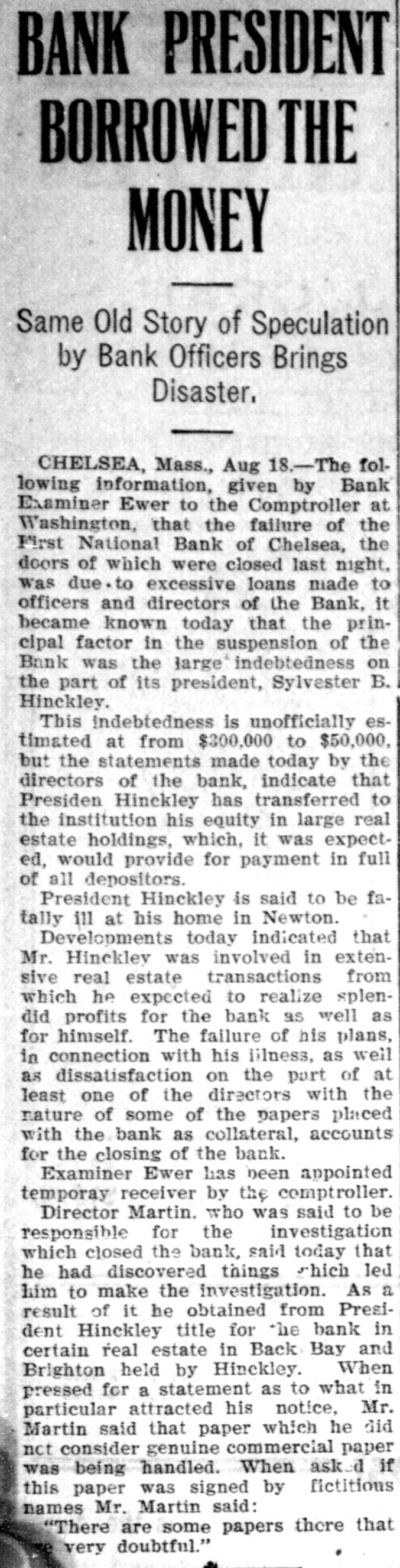 BANK PRESIDENT BORROWED THE MONEY Same Old Story of Speculation by Bank Officers Brings Disaster. CHELSEA, Mass., Aug 18.-The following information, given by Bank Examiner Ewer to the Comptroller at Washington, that the failure of the First National Bank of Chelsea, the doors of which were closed last night, was due to excessive loans made to officers and directors of the Bank, it became known today that the principal factor in the suspension of the Bank was the large indebtedness on the part of its president, Sylvester B. Hinckley. This indebtedness is unofficially estimated at from $300,000 to $50,000, but the statements made today by the directors of the bank, indicate that Presiden Hinckley has transferred to the institution his equity in large real estate holdings, which, it was expected, would provide for payment in full of all depositors. President Hinckley is said to be fatally ill at his home in Newton. Developments today indicated that Mr. Hinckley was involved in extensive real estate transactions from which he expected to realize splendid profits for the bank as well as for himself. The failure of his plans, in connection with his illness, as well as dissatisfaction on the part of at least one of the directors with the nature of some of the papers placed with the bank as collateral, accounts for the closing of the bank. Examiner Ewer has been appointed temporay receiver by the comptroller. Director Martin. who was said to be responsible for the investigation which closed the bank, said today that he had discovered things which led him to make the investigation. As a result of it he obtained from President Hinckley title for the bank in certain real estate in Back Bay and Brighton held by Hinckley. When pressed for a statement as to what in particular attracted his notice, Mr. Martin said that paper which he did nct consider genuine commercial paper was being handled. When asked if this paper was signed by fictitious names Mr. Martin said: "There are some papers there that very doubtful." .