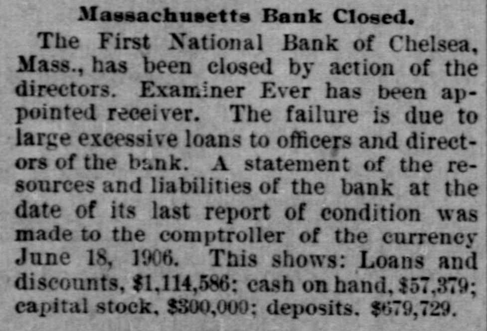 Massachusetts Bank Closed. The First National Bank of Chelsea, Mass., has been closed by action of the directors. Examiner Ever has been appointed receiver. The failure is due to large excessive loans to officers and directors of the bank. A statement of the resources and liabilities of the bank at the date of its last report of condition was made to the comptroller of the currency June 18, 1906. This shows: Loans and discounts, $1,114,586: cash on hand, $57,379; capital stock, $300,000; deposits. $679,729.